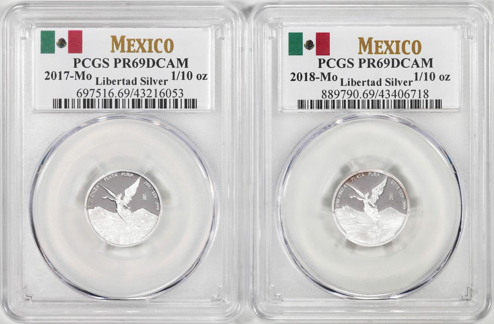 One Lot of 2017-2018-Mo Mexico Proof 1/10 oz Silver Libertad Coins PCGS PR69DCAM. PCGS Graded.