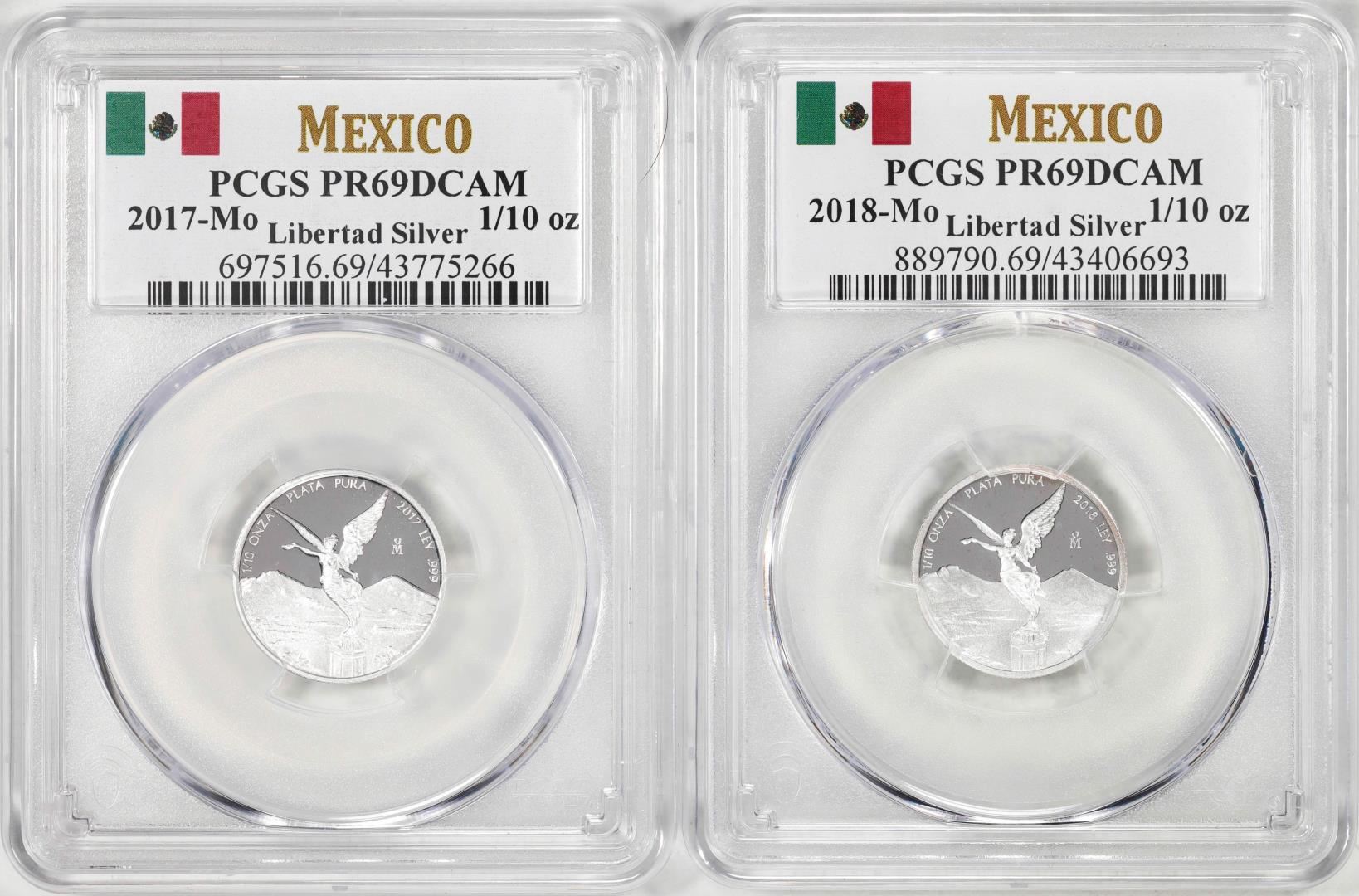 One Lot of 2017-2018-Mo Mexico Proof 1/10 oz Silver Libertad Coins PCGS PR69DCAM. PCGS Graded.