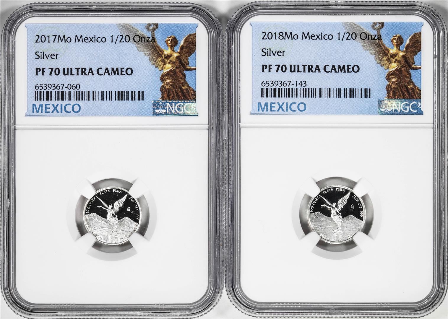One Lot of 2017-2018-Mo Mexico Proof 1/20 oz Silver Libertad Coins NGC PF70 Ultra Cameo. NGC Certified.
