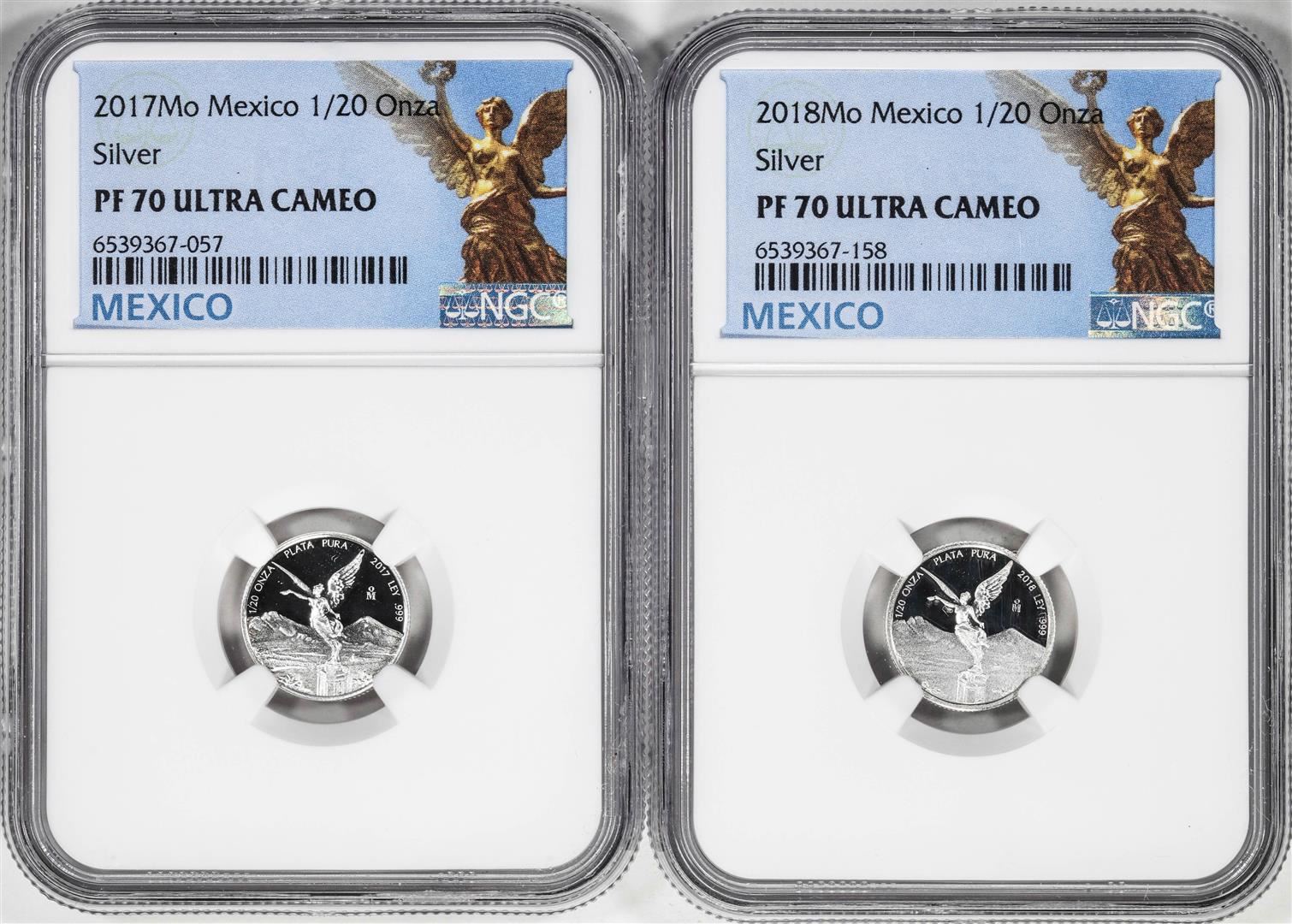 One Lot of 2017-2018-Mo Mexico Proof 1/20 oz Silver Libertad Coins NGC PF70 Ultra Cameo. NGC Certified.