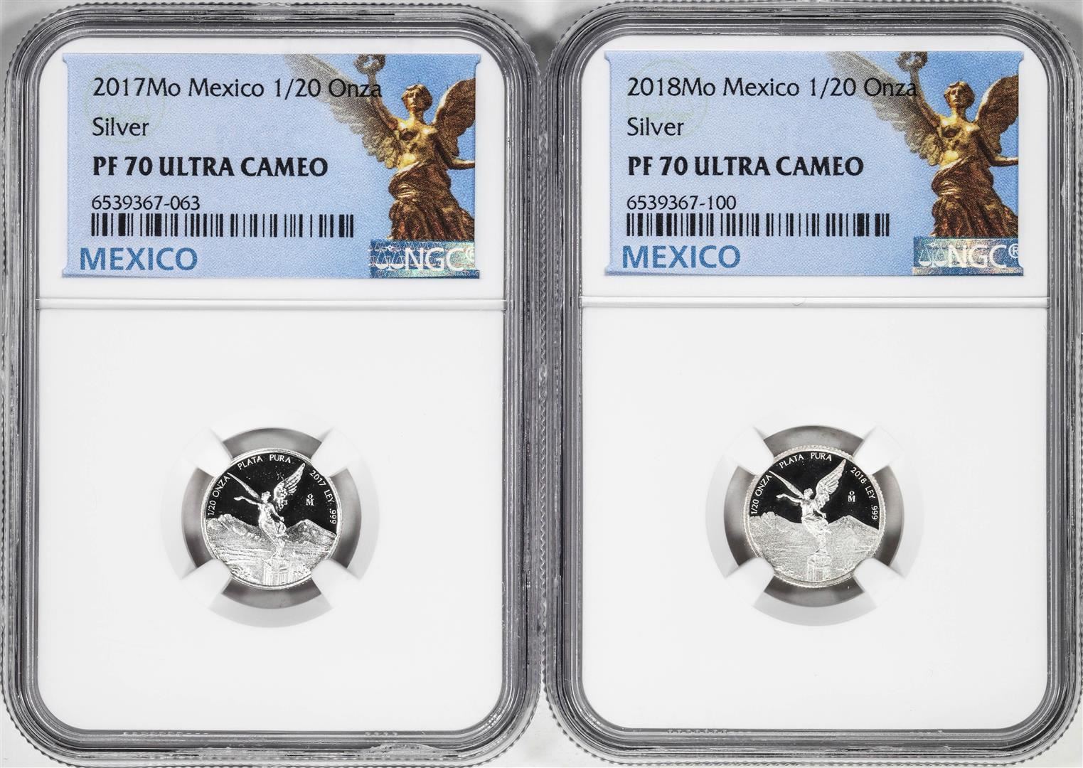 One Lot of 2017-2018-Mo Mexico Proof 1/20 oz Silver Libertad Coins NGC PF70 Ultra Cameo. NGC Certified.