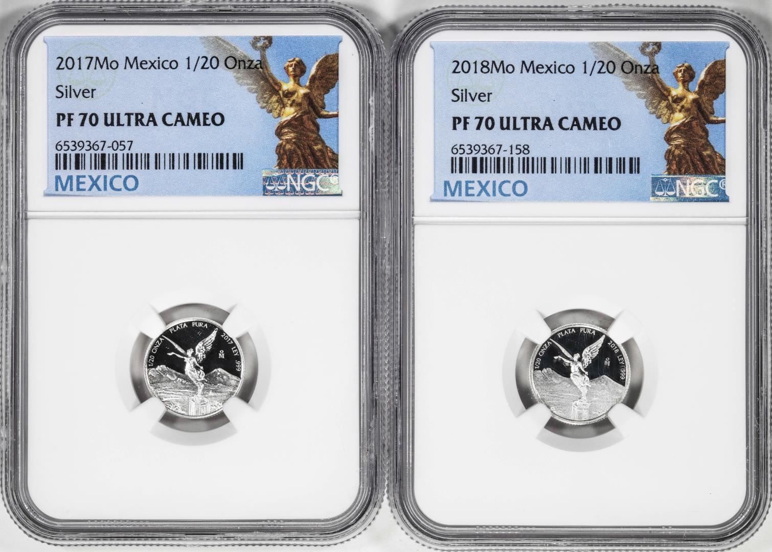 One Lot of 2017-2018-Mo Mexico Proof 1/20 oz Silver Libertad Coins NGC PF70 Ultra Cameo. NGC Certified.