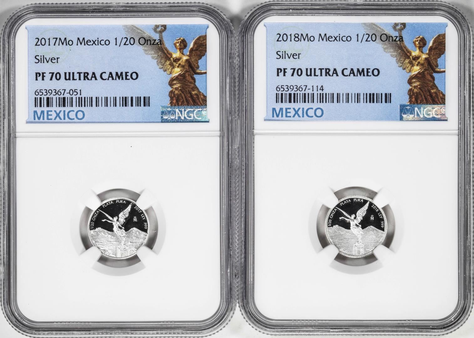 One Lot of 2017-2018-Mo Mexico Proof 1/20 oz Silver Libertad Coins NGC PF70 Ultra Cameo. NGC Certified.