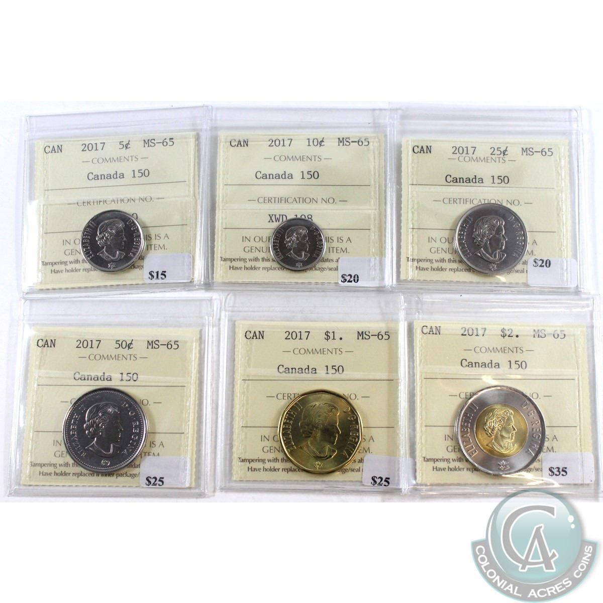 Lot of 2017 Canada 150th ICCS Certified MS-65 Commemorative Collection. You will receive the 5-cent, 10-cent, 25-cent, 50-cent, $1, and $2 bearing the 150th designs. 6pcs.