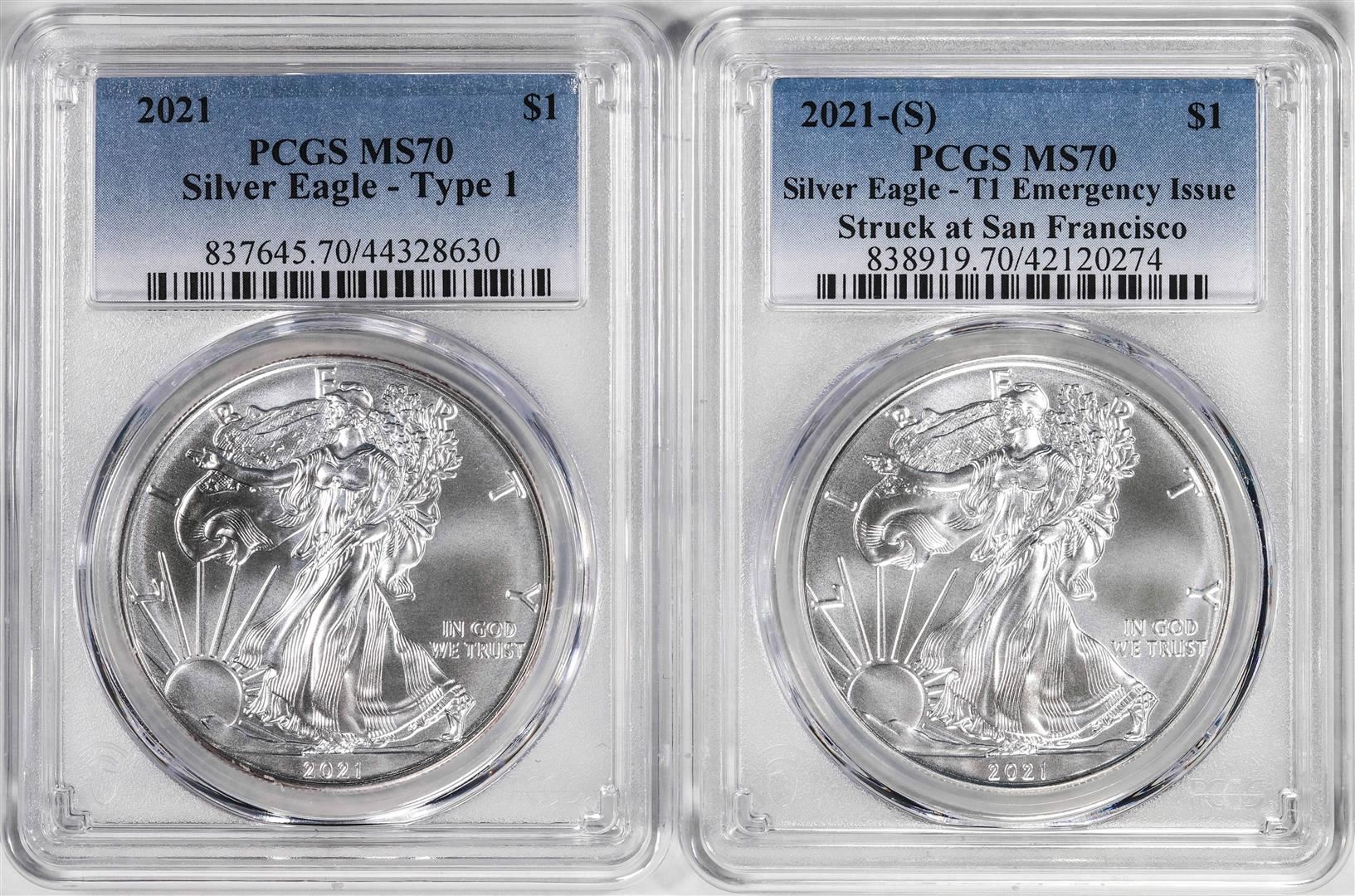 Lot of 2021 & 2021-(S) Type 1 $1 American Silver Eagle Coins PCGS MS70