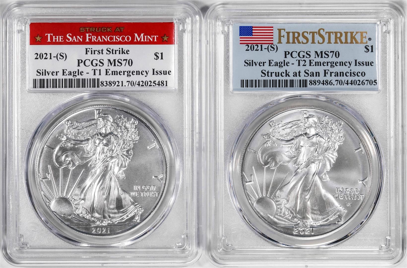 Lot of 2021-(S) Type 1 & 2 $1 American Silver Eagle Coins PCGS MS70 First Strike