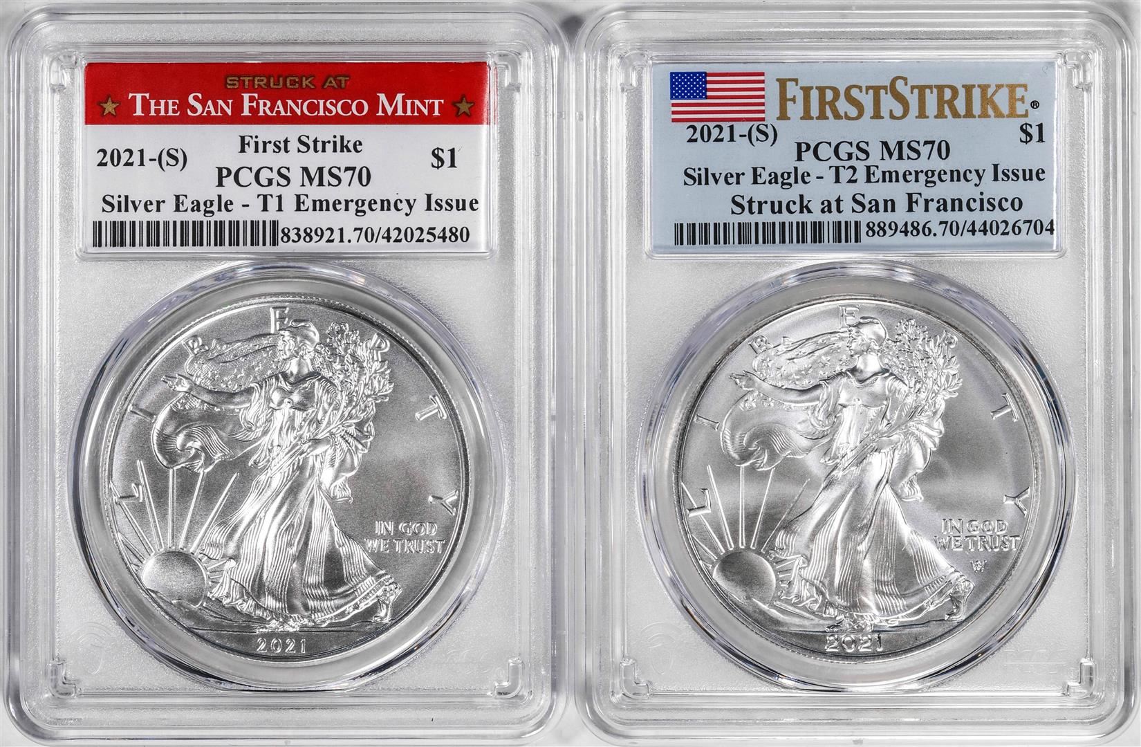 Lot of 2021-(S) Type 1 & 2 $1 American Silver Eagle Coins PCGS MS70 First Strike