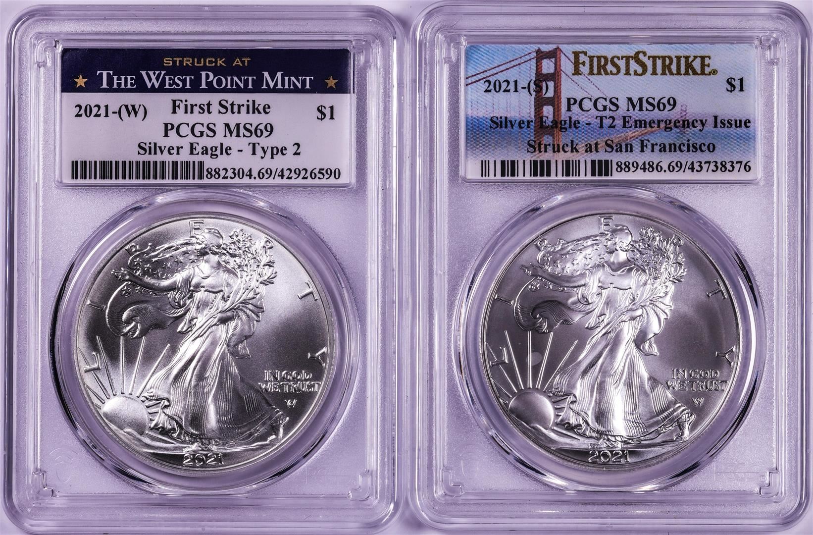 Lot of 2021-(S) & (W) Type 2 $1 American Silver Eagle Coins PCGS MS69 First Strike