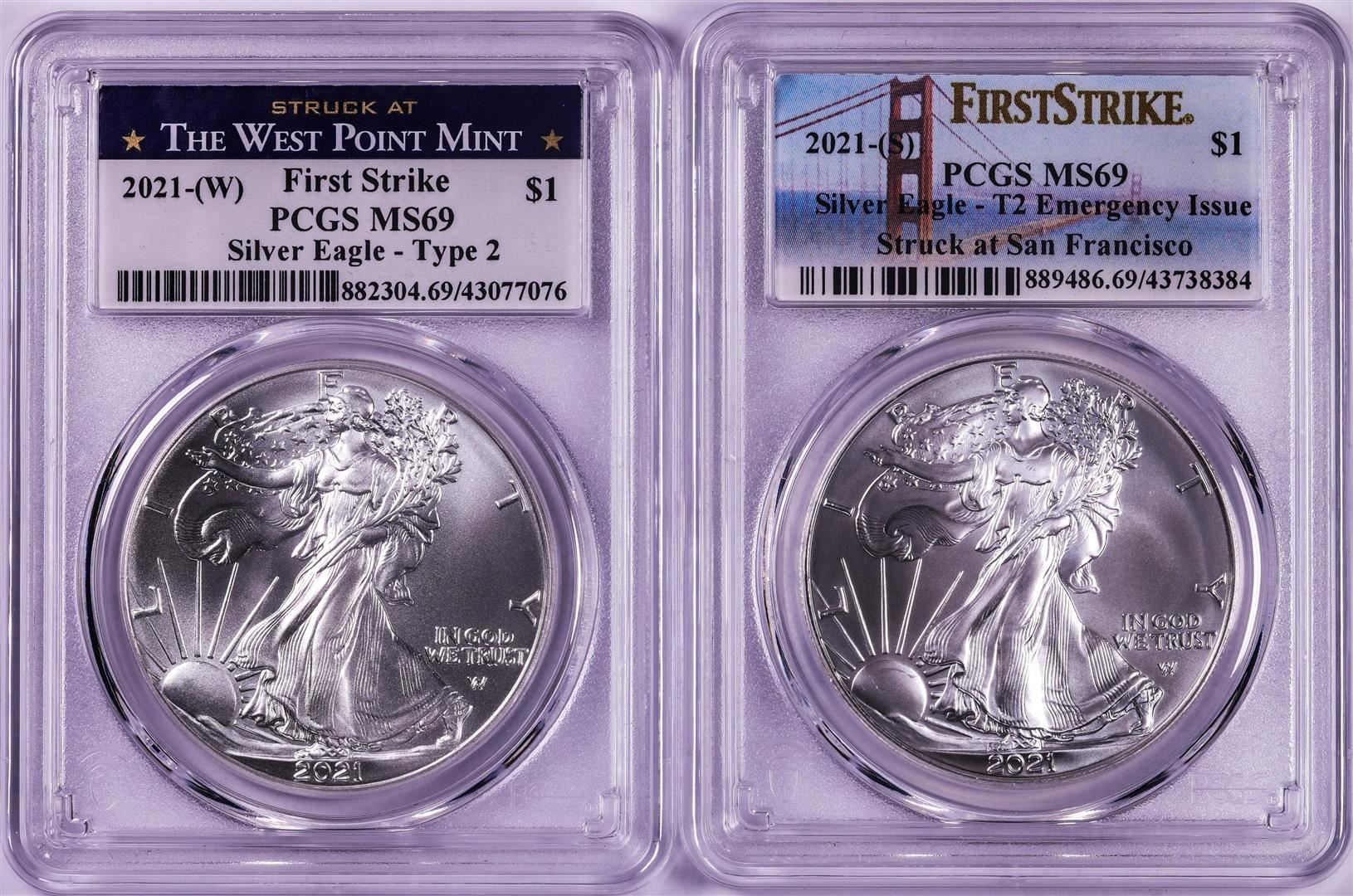 Lot of 2021-(S) & (W) Type 2 $1 American Silver Eagle Coins PCGS MS69 First Strike
