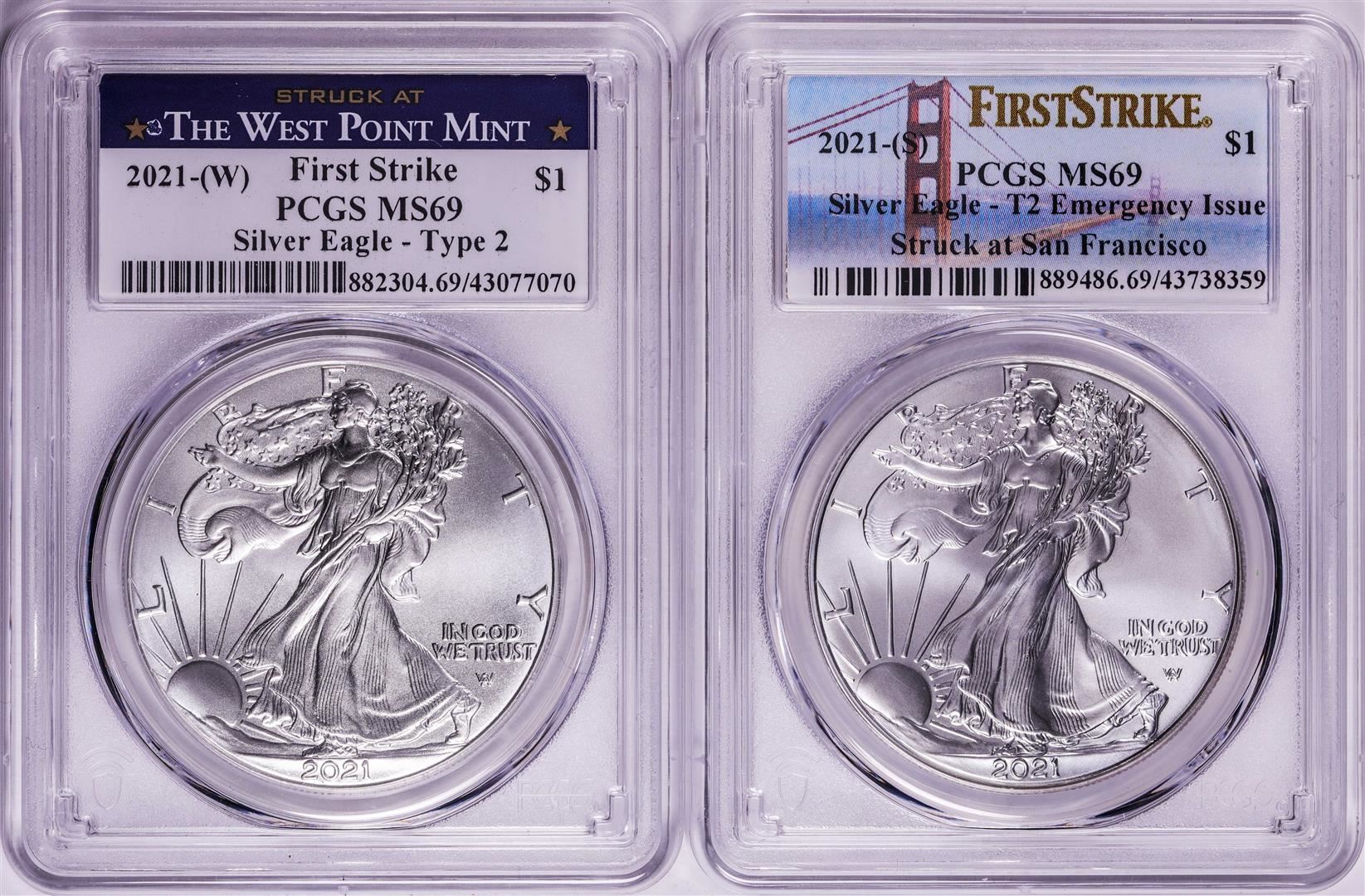 Lot of 2021-(S) & (W) Type 2 $1 American Silver Eagle Coins PCGS MS69 First Strike