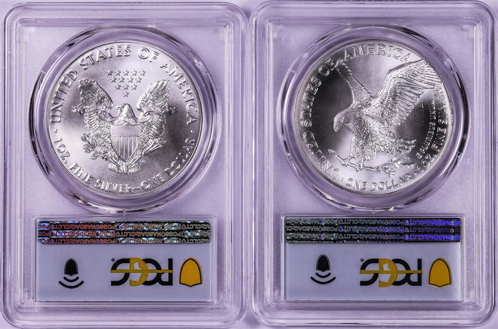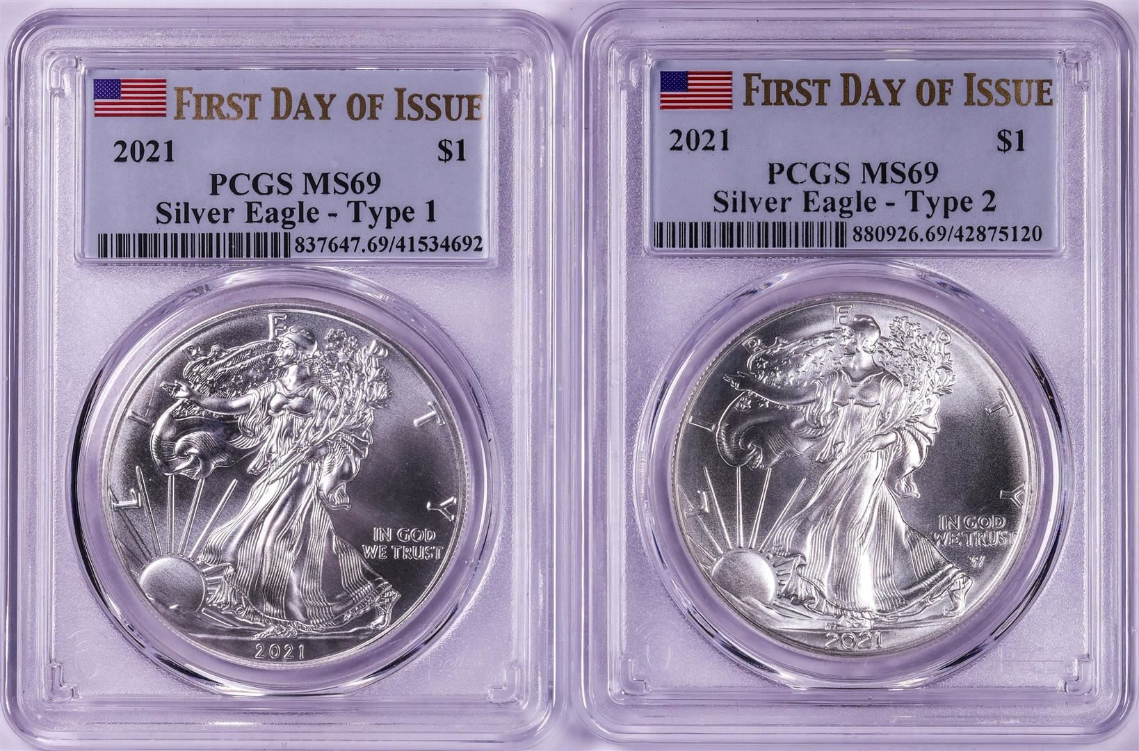 One Lot of 2021 Type 1 & 2 $1 American Silver Eagle Coins PCGS MS69 First Day of Issue.