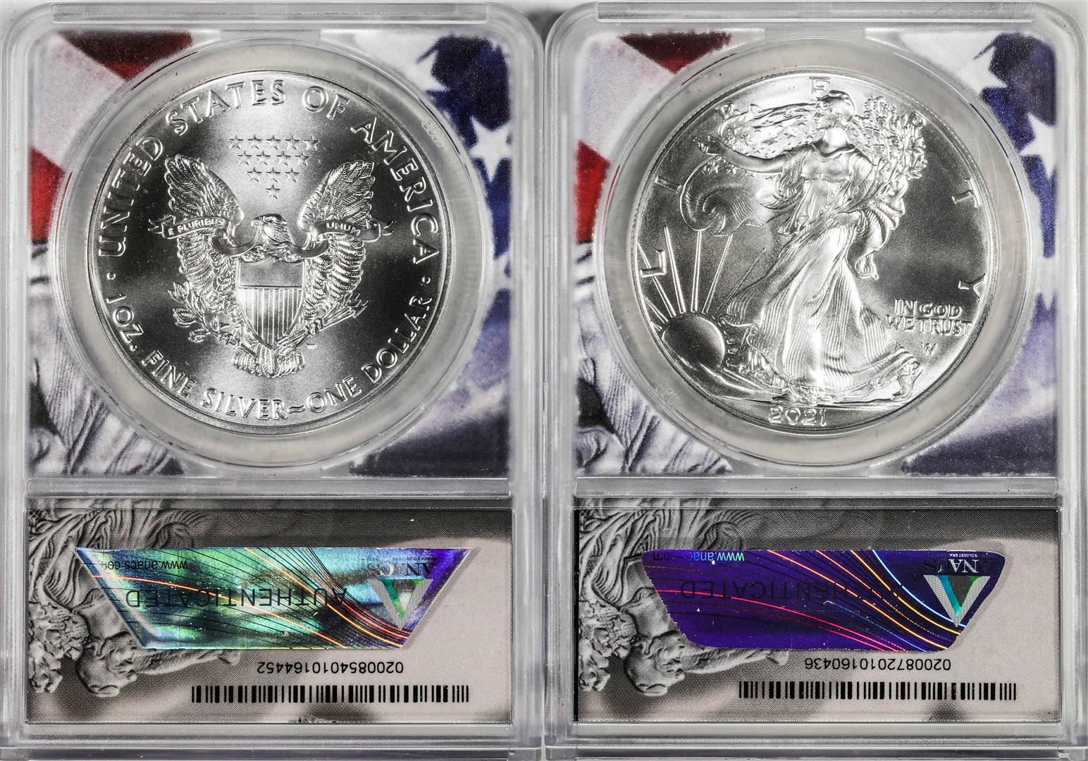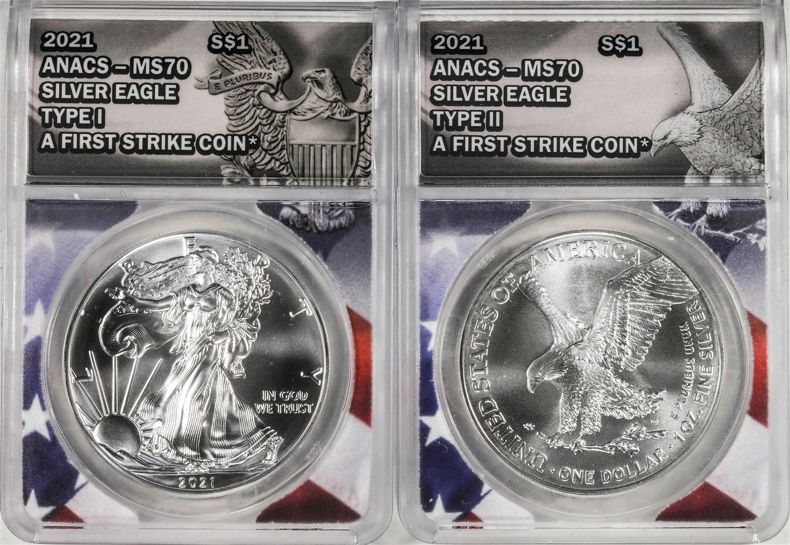One Lot of 2021 Type 1 & Type 2 $1 American Silver Eagle Coins ANACS MS70 First Strike. ANACS Certified.