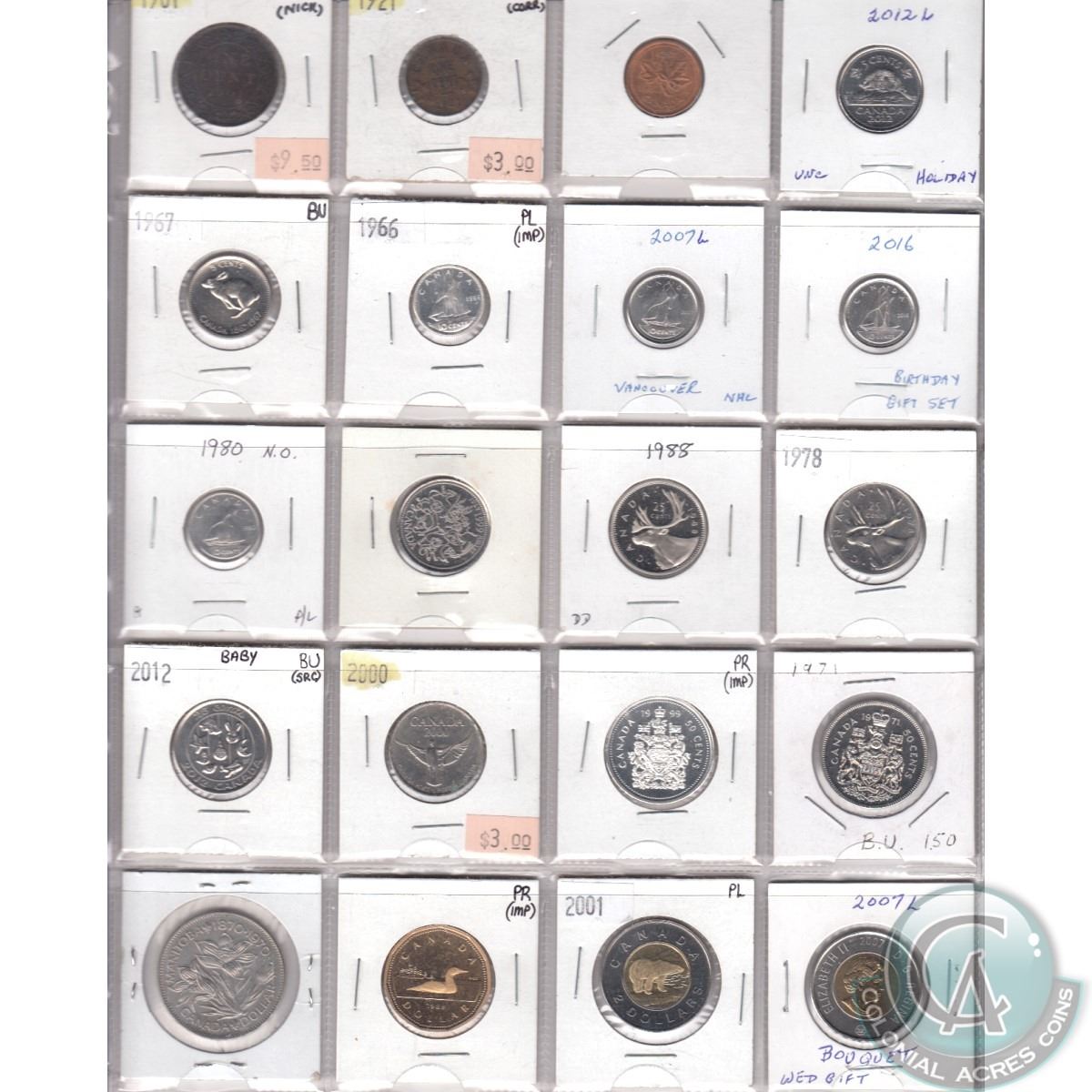 Lot of 20x Canada 1-cent to $2 Dated 1901-2016 with Some Proof, Proof Like, and/or BU in Plastic 20-Pocket Page. 20pcs