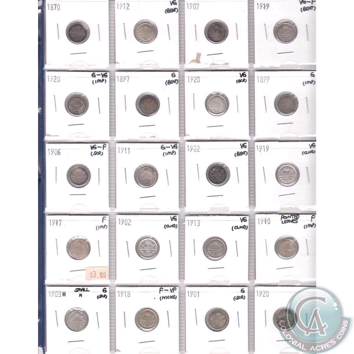 Lot of 20x Canada Small 5-cent Dated 1870-1920 in Plastic 20-Pocket Page. 20pcs