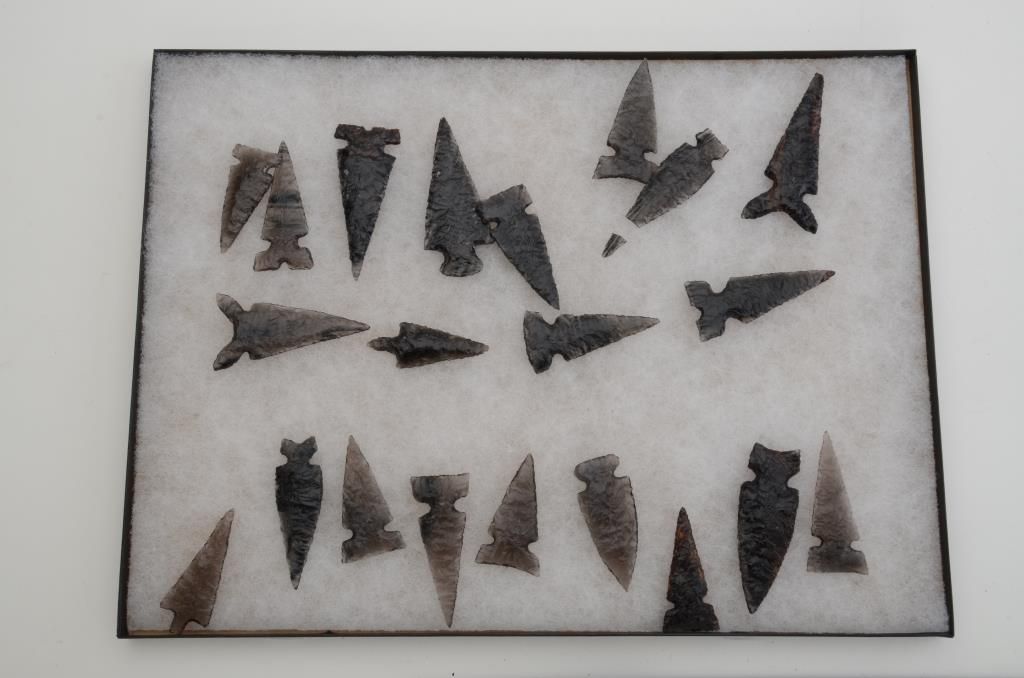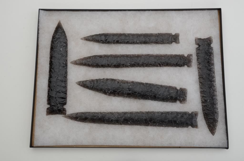 Lot of 21 hand chipped stone arrowheads and 6 large hand chipped stone lance blades, all in very good condition and in riker cases; age unknown as we are not experts in this area but beautifully accomplished; arrowheads are approx. 2”-3” in length and the lance blades are approx. 8”-9” long. Est.: $300-$600.