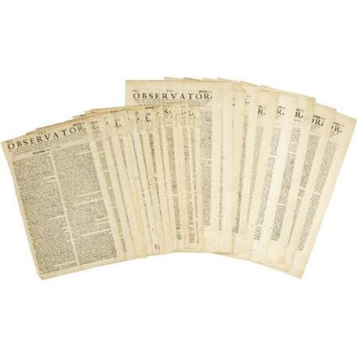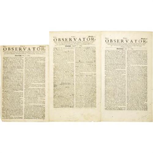 <B>Lot of 22 Editions Circa 1684 of </B></I><B><I>The Observator</B></I></B></I><I>,</B></I> <B>A London Newspaper.</B></I> Each issue two pages, 7.5” x 12”, editions date from 1684 to 1685, several examples appear to have been disbound from a book, toned, especially at the edges, else in near fine condition. <I>The Observator</B></I> was published from April 13, 1681 until 1686 or possibly 1687. It was published under the auspices of Roger L'Estrange, an English pamphleteer and author, and staunch defender of royalist claims. In 1644 he led a conspiracy in support of King Charles I and was sentenced to death as a spy, but after serving four years' imprisonment he was able to escape to the Continent. Given L'Estrange's inflammatory nature, these papers will surely provide hours of seditious reading. <I>From the collection of Henry E. Luhrs.</B></I> <BR><BR><b>Shipping:</b> Flat Material, Small (<a target="_blank" href="http://www.heritageauctions.com/common/shipping.php">view shipping information</a>)