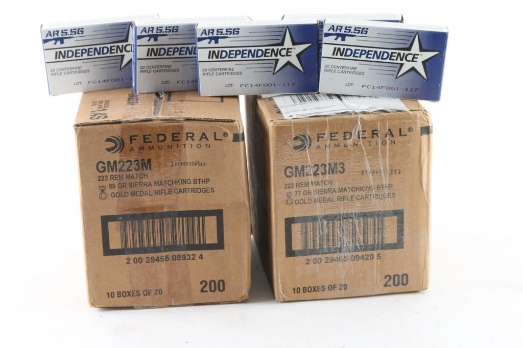 Approx. 500 rounds of factory new 5.56 X 45mm & .223. 100 rounds of Independence 5.56 X 45mm, 55 Gr. FMJ & 400 rounds of Federal 77 Gr. BTHP. All in factory boxes.