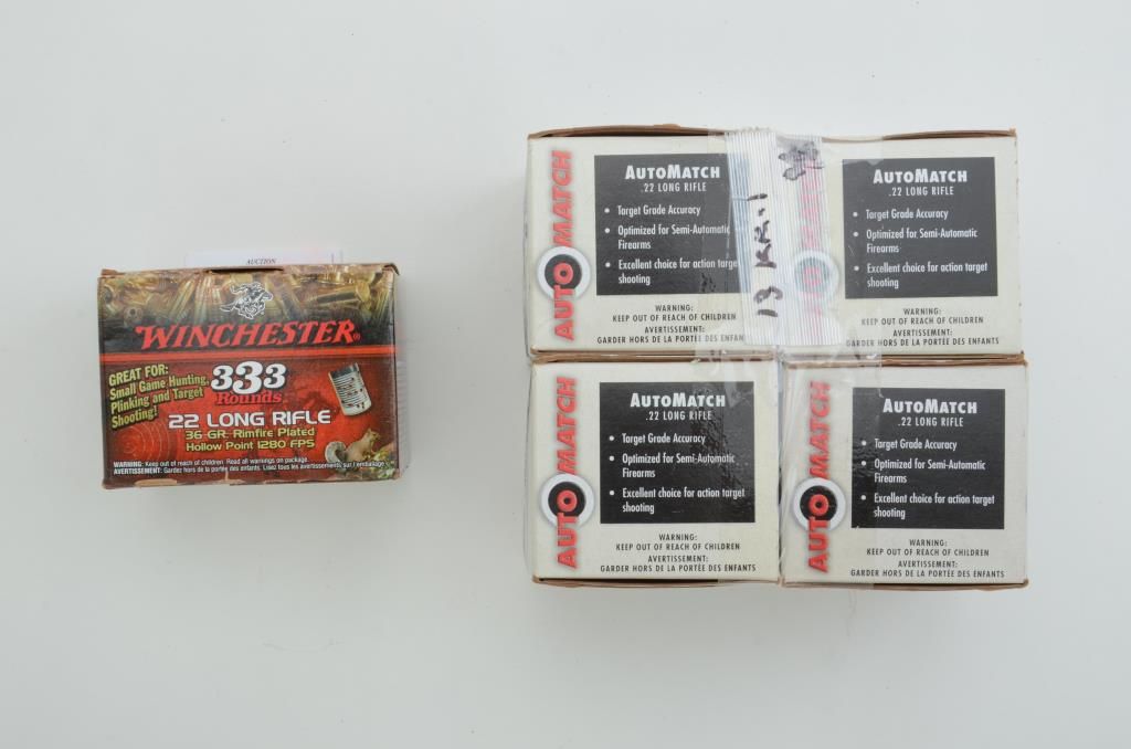 Lot of .22LR ammunition; 4 boxes of Federal Auto Match (1300 rounds) and a box of Winchester (333 rounds). Est.: $200-$400.