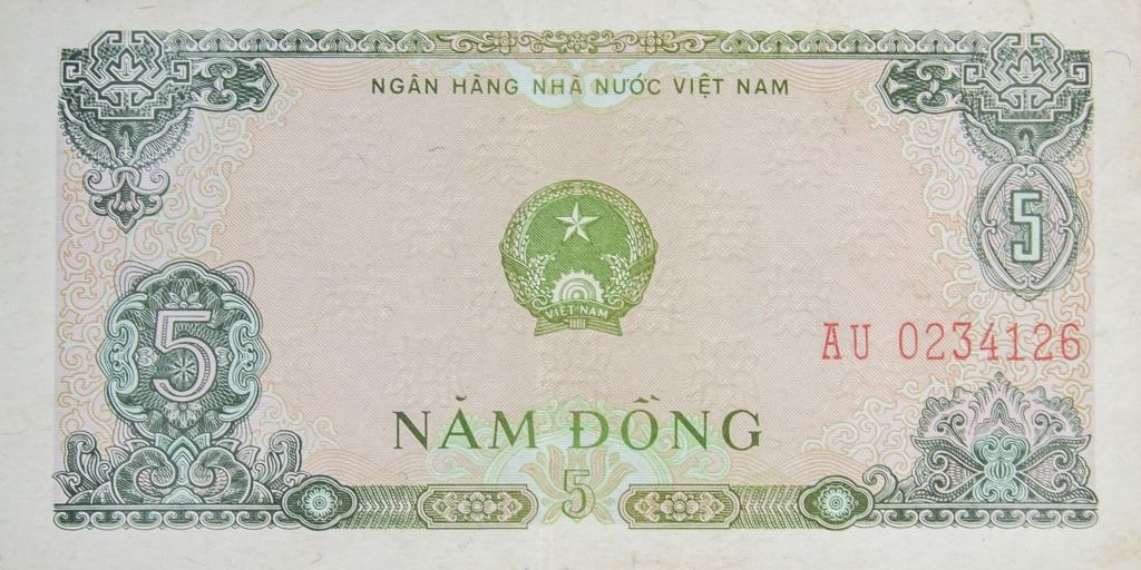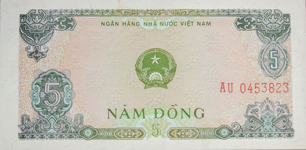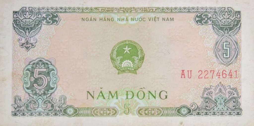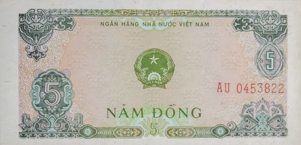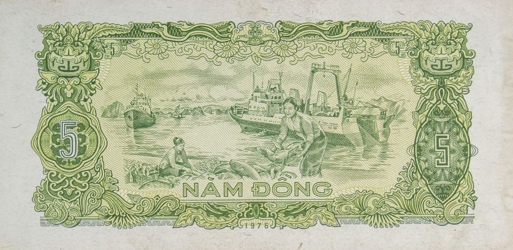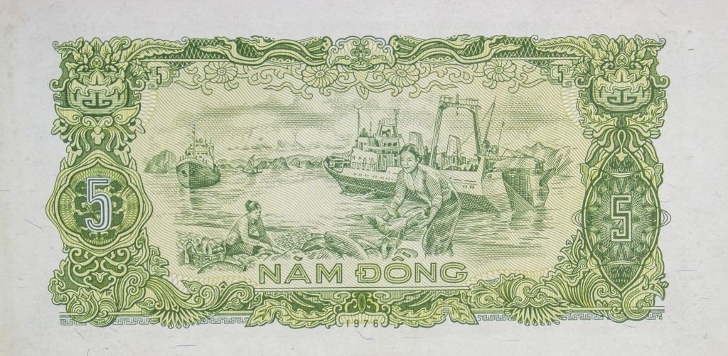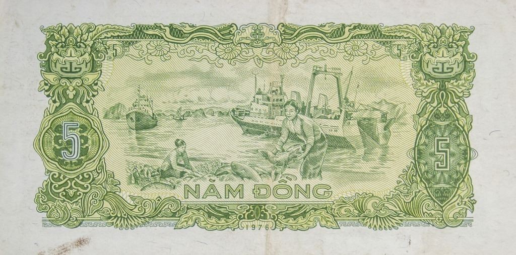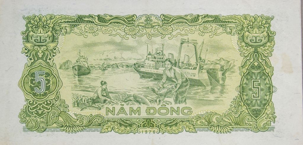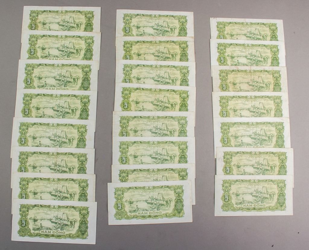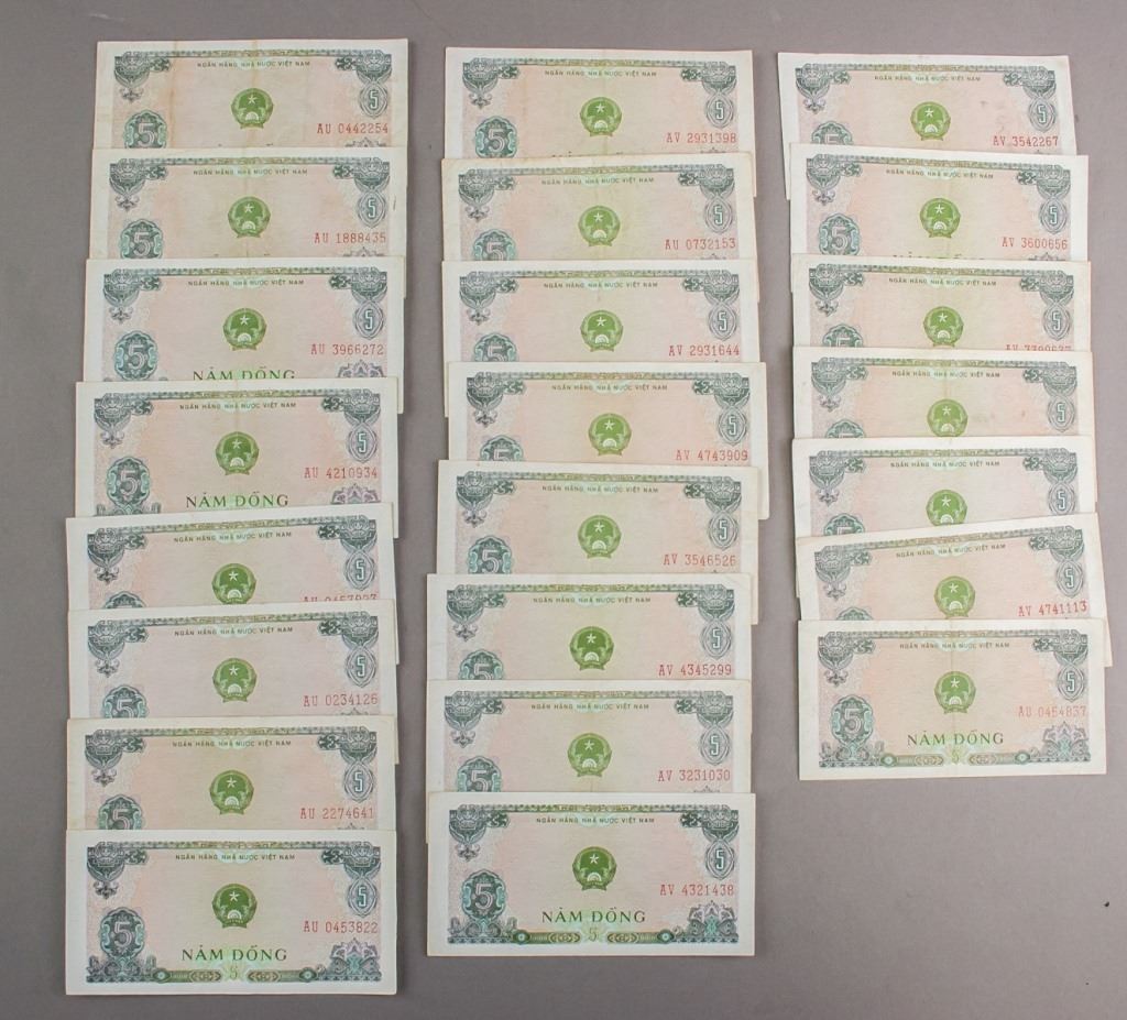 Lot of 23 Vietnamese paper money. Obverse: Blue-grey and green on pink under print. Vietnam arms. Reverse: Green on yellow underprint. Two women with fish in foreground, boats in harbour in background. Of denomination 5 Dong.