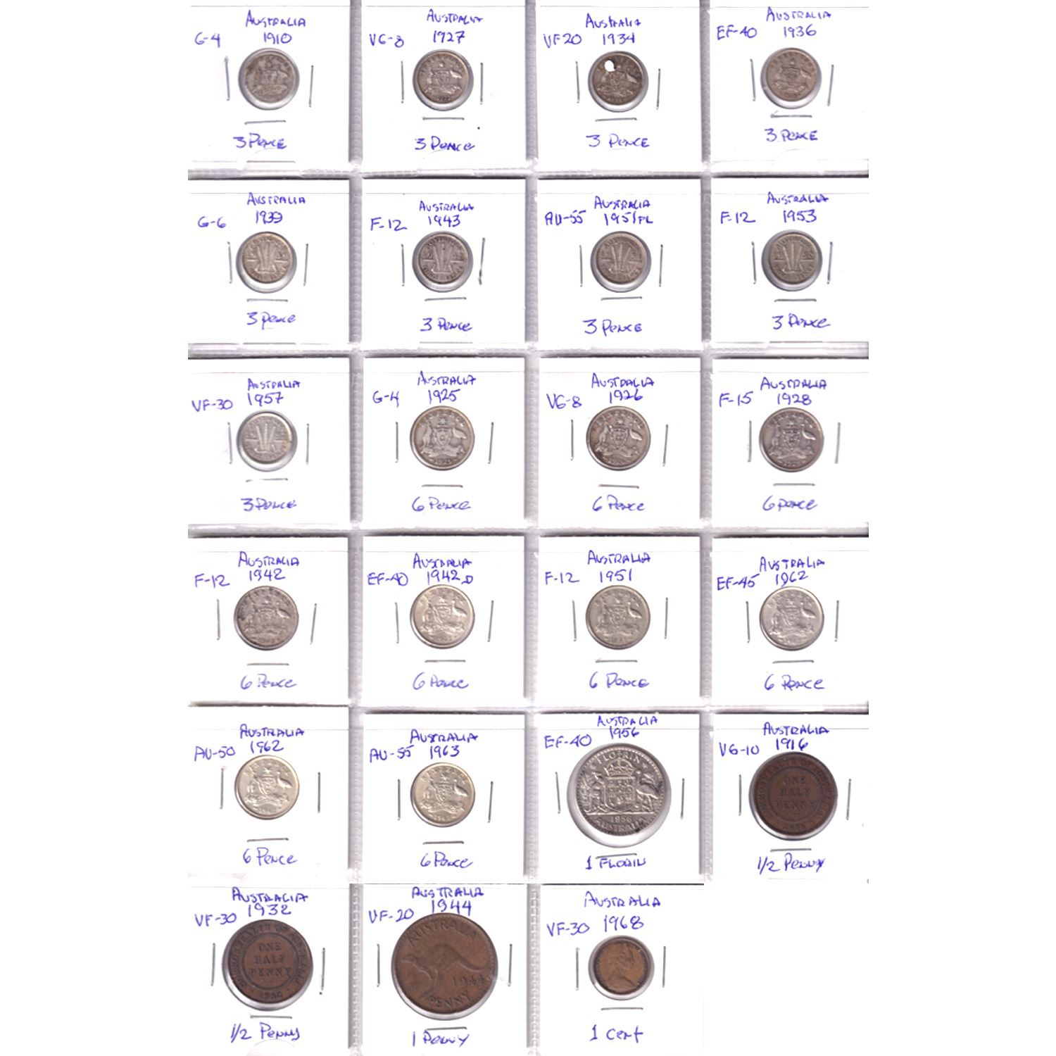 Lot of 23x 1910-1967 Australia coins : you will receive 9x 6-pence dated between 1910-1957, 9x 6-pence dated between 1925-1963, 1x 1956 1 Florin, 1x 1916 1/2 Penny, 1932 1/2 half Penny, 1944 1-penny & a 1968 1-cent. 23pcs