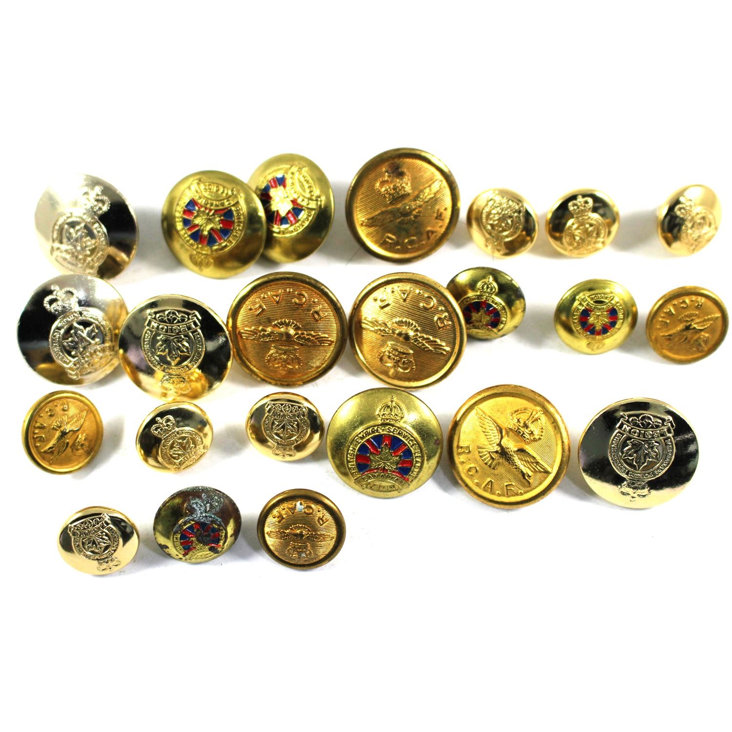 Lot of 23x Royal Canadian Air Force and Royal Canadian Legion Buttons. Including 4x Large RCAF and 3x Small RCAF Buttons, 4x Large Legion and 6x Small Legion Buttons, and 3x Large Coloured Legion and 3x Small Coloured Legion Buttons. Some buttons have some corrosion.