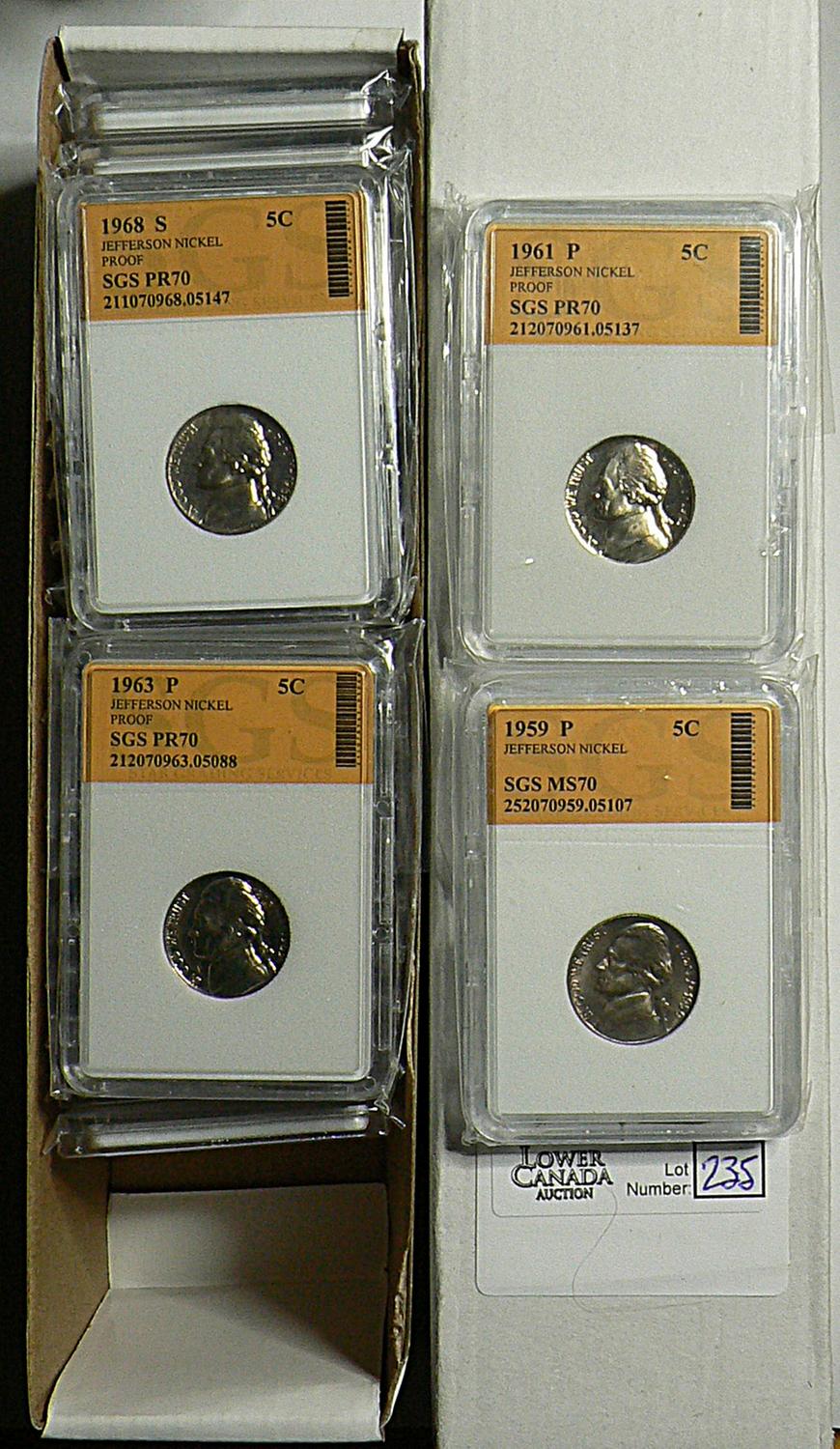 Lot of 24 Jefferson Nickel graded SGS, all are PR70, except 1, 1959P is MS-70. Mostly Cameo's, years are; 1959P, 1961P, 1963P, 1968S, 1970S, 1972S, 1973S, 1976S, 1978S, 1980S, 1982S, 1984S, 1986S, 1988S, 1990S, 1992S, 1994S, 1996S, 1998S, 2000S, 2002S, 2004S-T1, Louisiana Purchase, Cameo, 2005S-T1, American Bison Cameo, 2006S, Return to Monticello , Cameo.