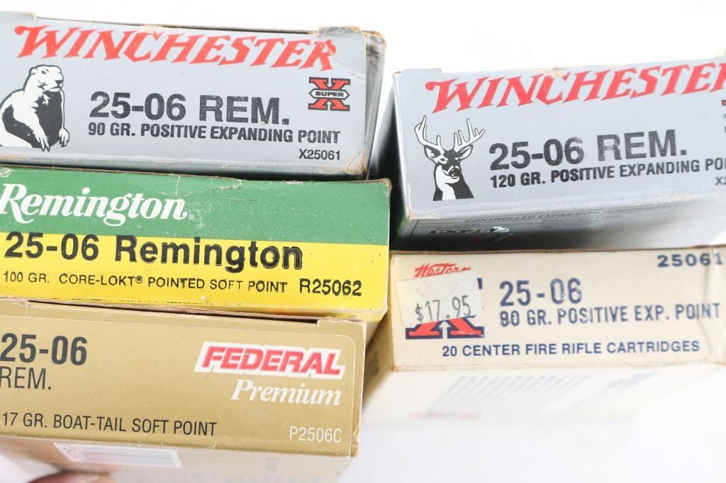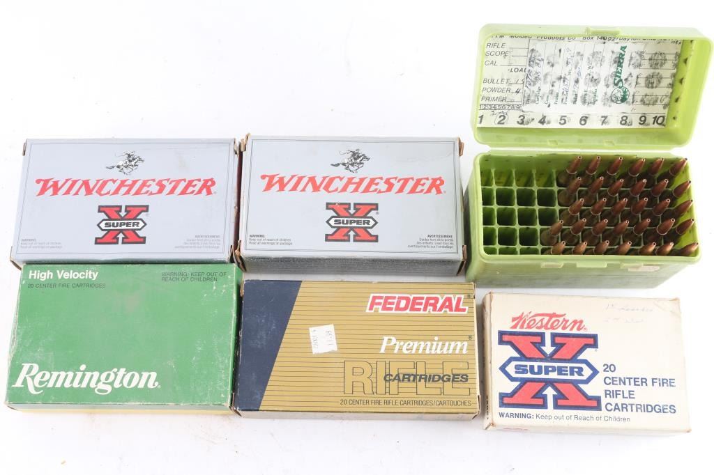 Approximately 8 lbs with box. (20) Winchester 90 Gr HP; (20) Winchester 120 Gr HP; (20) Remington 100 Gr Soft Pt; (20) Federal 117 Gr Soft Pt.; (20) reload 87 Gr Soft Pt; (32) Hornady 53 Gr HP. In factory boxes.
