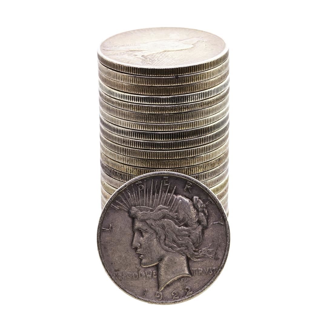 One Lot of (25) $1 Peace Silver Dollar Coins.
