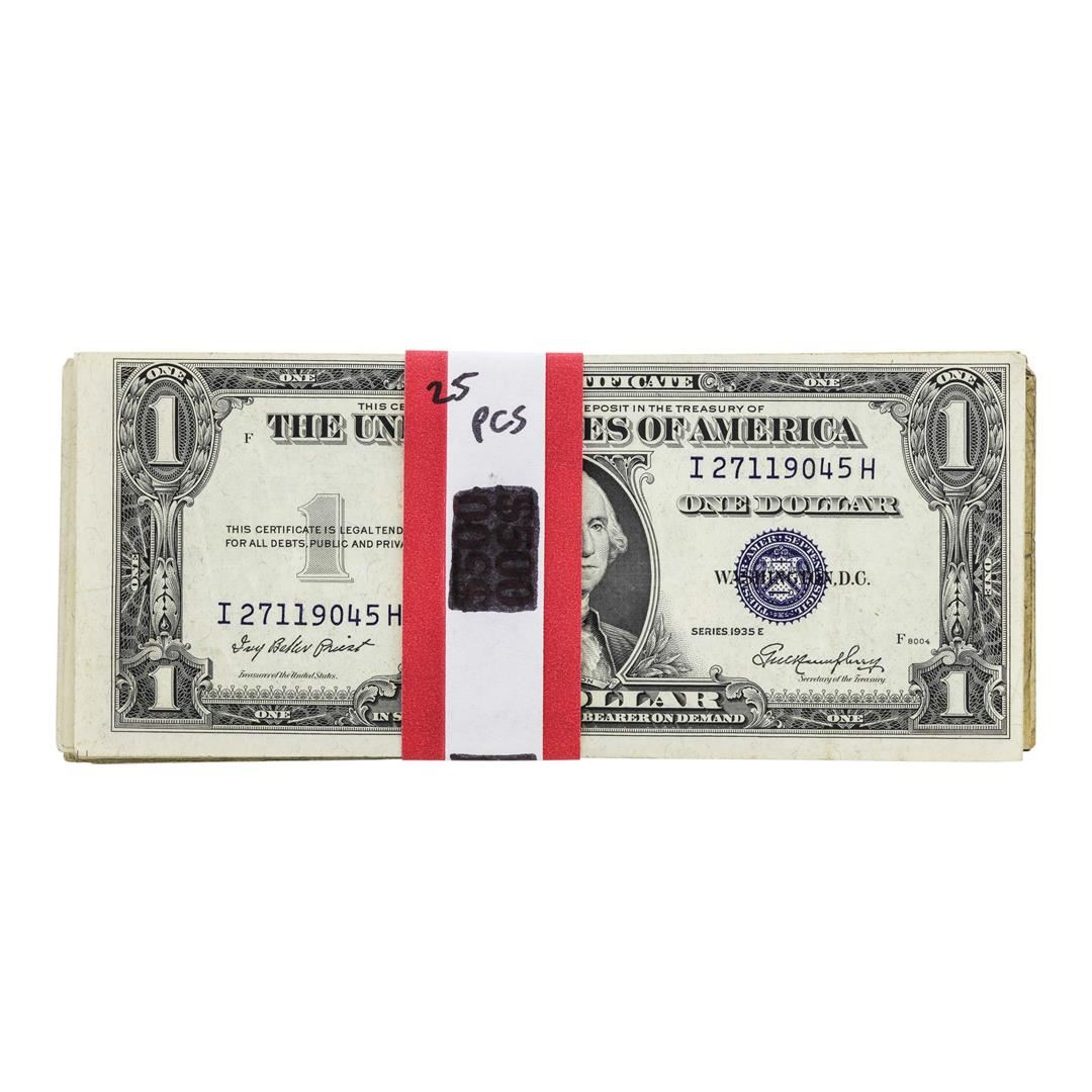 One Lot of (25) 1935E $1 Silver Certificate Notes - Circulated. These notes are from Fine to Very Fine condition, some notes may contain tears, stains, or other minor damage.