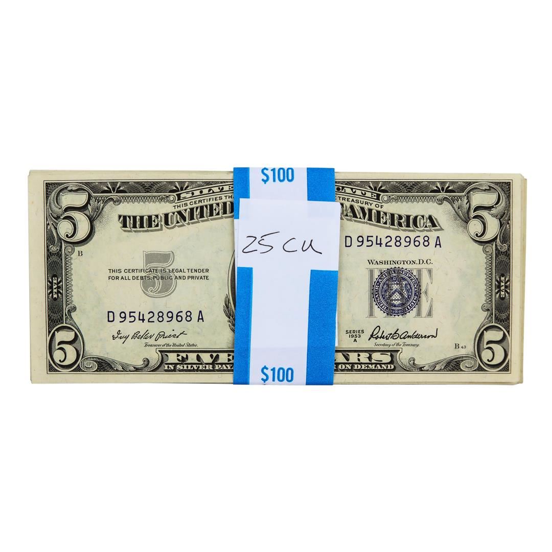 One Lot of (25) 1953A $5 Silver Certificate Notes CU.