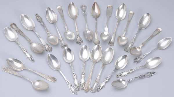 Description Weighs 19.5 troy ounces. Includes examples by Lunt, Whiting, Gorham, and Towle along with a coin silver example. Condition (Good). Size Average: 5 - 7/8" L.