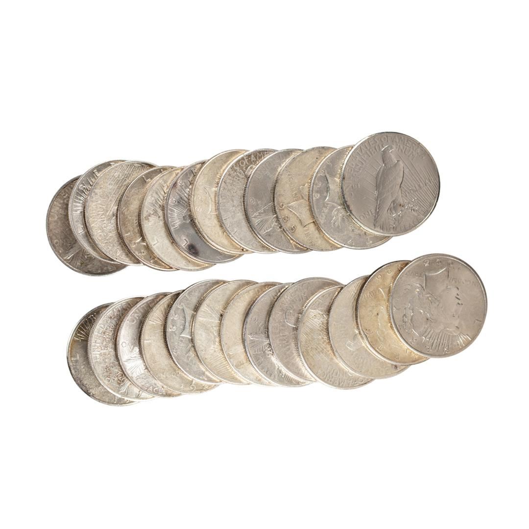 One Lot of (25) Circulated 1922-1935 $1 Peace Silver Dollar Coins.