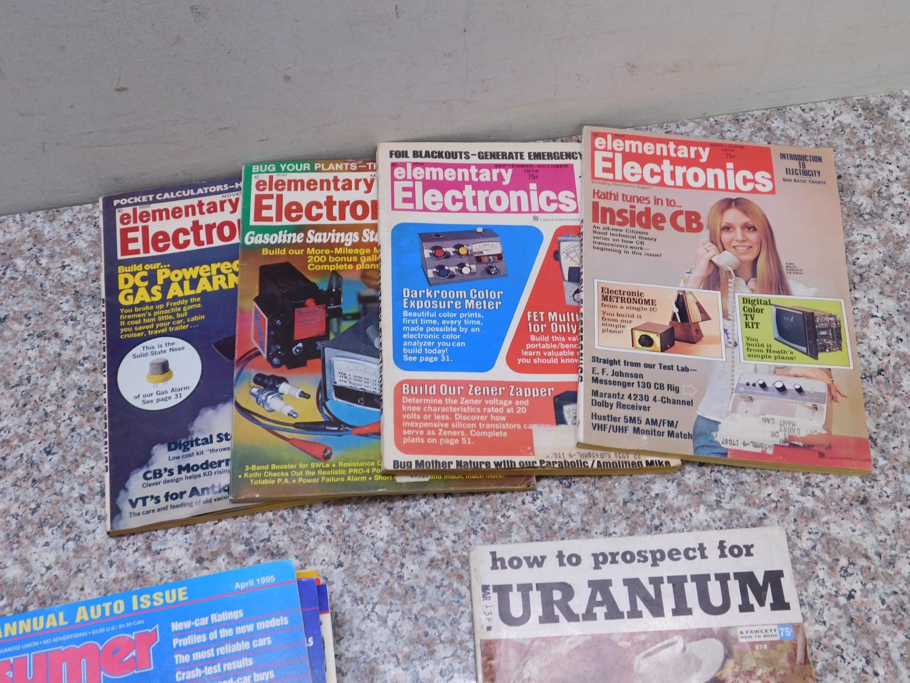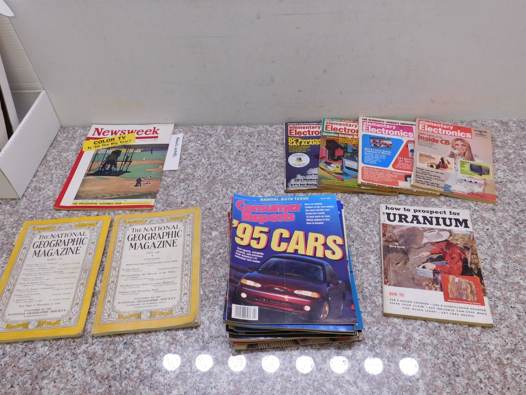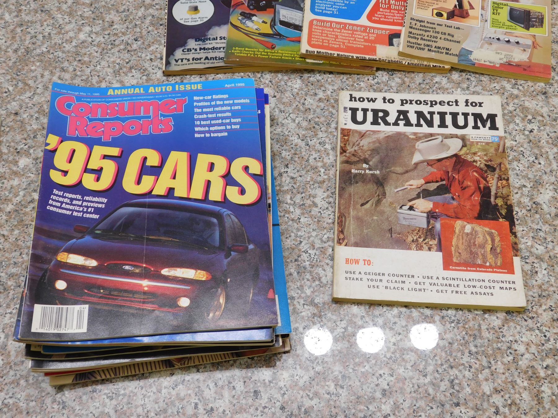 newsweek from oct 3 1955, national geographic from june 1928 and mar 1947, how to prospect uranium, elementary electronics books from 1974, lot of consumer reports magazines from 1993-96