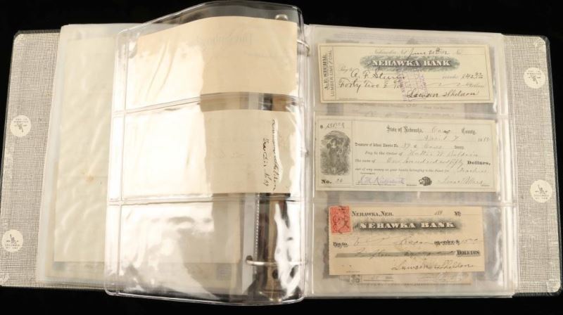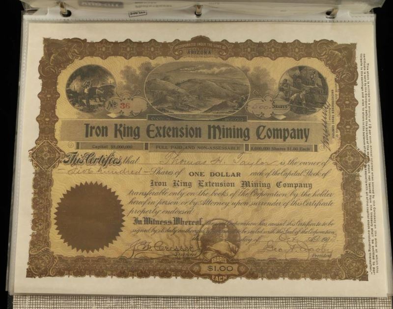 Including; 1795 receipt stating duty on brandy was paid, 1781 pay table for Ralph Pomeroy, 1803 receipt for county tax, 1903 check from the Yellow Aster Mining and Milling Co., 1903 stock from the Iron King Extension Mining Company, 1923 German Bond, a few photos several other checks, and receipts. Interesting assortment for the collector.