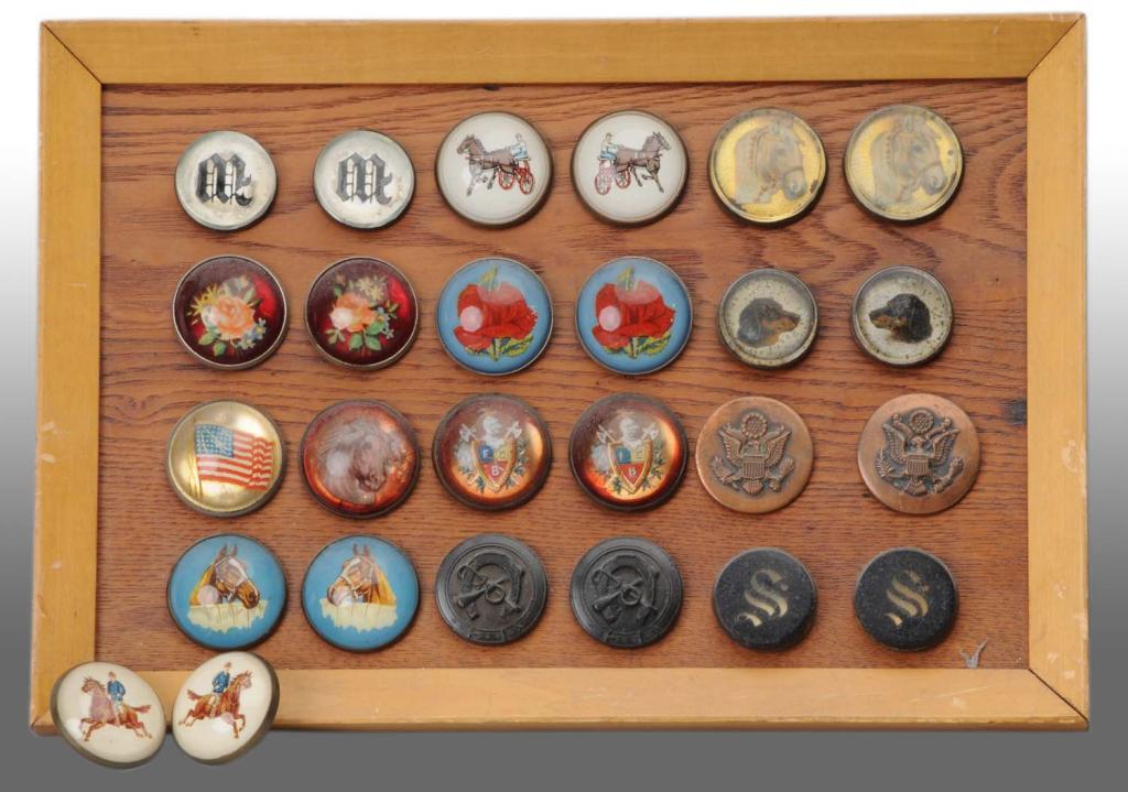 Description Includes 13 pairs. 12 pairs mounted on wooden frame and one pair is loose but none of them are glued and could be easily removed. Condition (Excellent). Size Largest: 1 - 3/4" Dia.