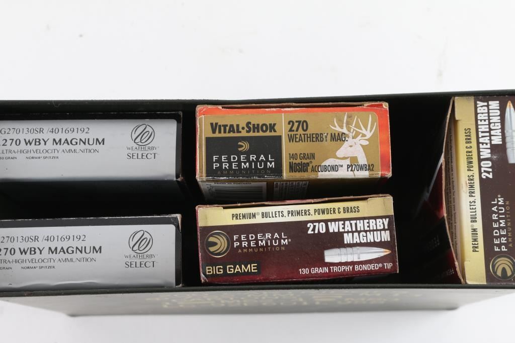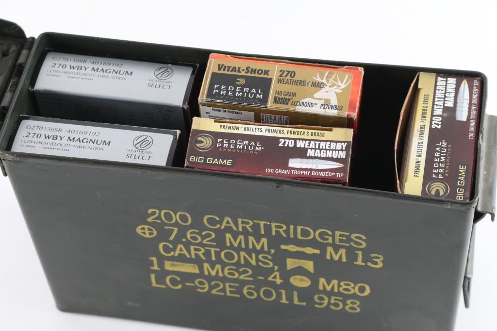 GI Ammo can containing two boxes of Federal Premium 20 rounds each of Big Game 130 grain Trophy bonded tip. One box of Federal Premium Vital Shok 140 grain Nosler Accubond. Two Boxes of 20 rounds each of Weatherby Select ultra-high velocity Norma Spitzer 130 grains. Total of 100 rounds. Very good condition