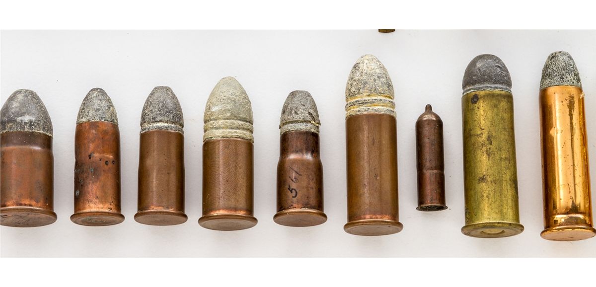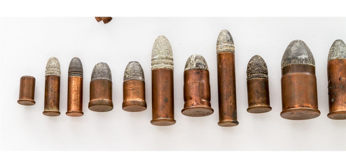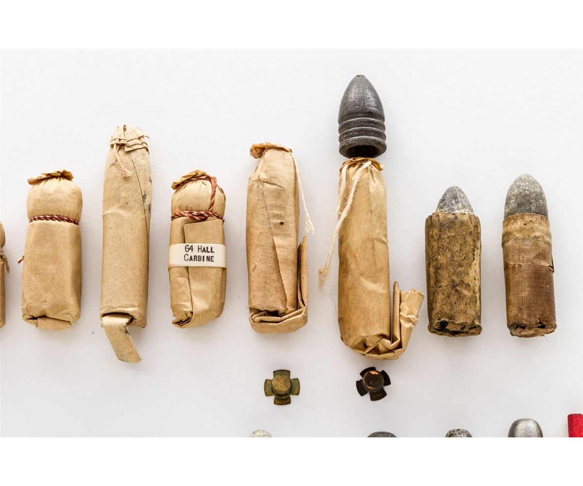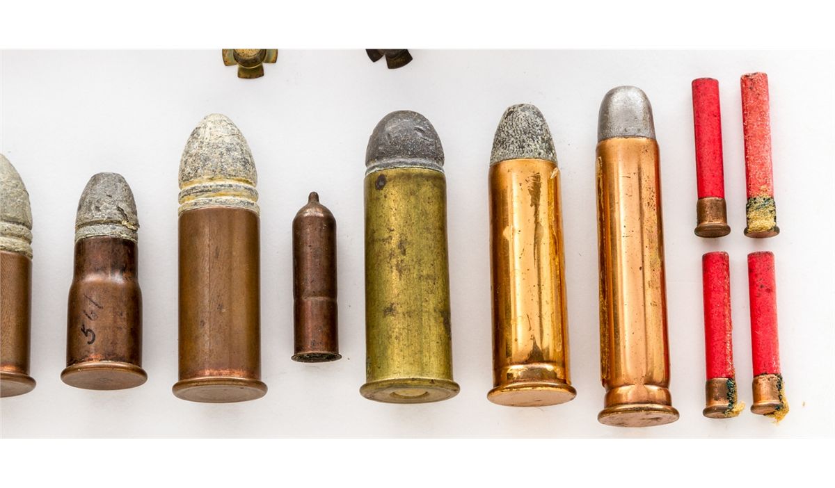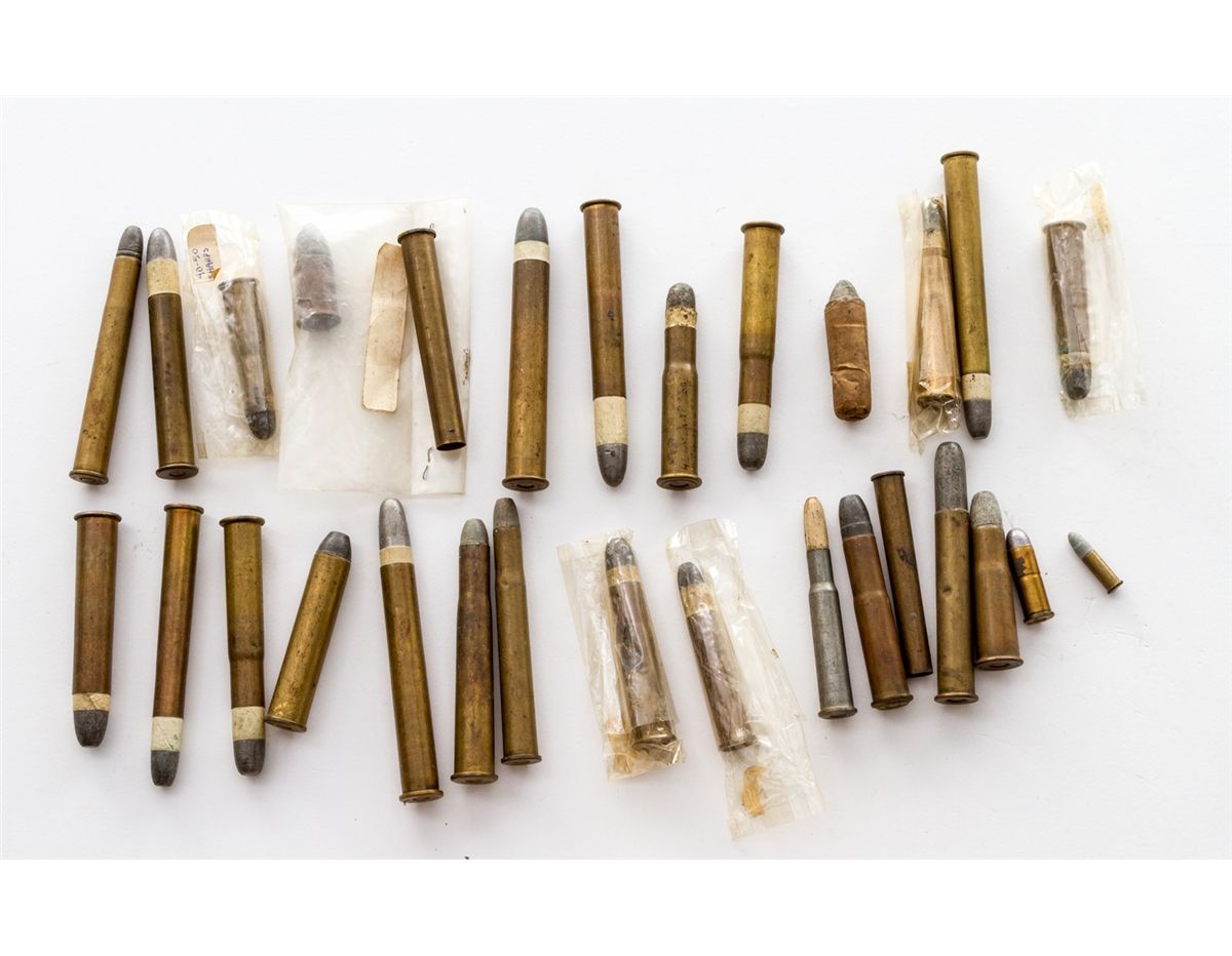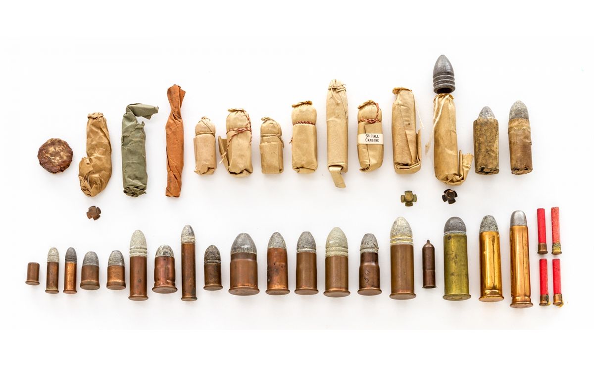 Lot of Approx. Twenty-Eight (28) Mid- to Late 19th Century Metallic and Non-Metallic Cartridges, including .45-70, .50-70, .64 Hall, rounds for Model 1833 Carbine, .54 Mississippi rifle, .58 Gatling Short, U.S. Pistol Model 1842, .58 cal. Musket, .38 Extra-Long, 12mm Perrin, .46 Long, Spencer bottleneck, and various others. Along with various loose Spencer rounds. Condition to all is fine to excellent. Highly collectible. Est.: $1,200-$1,800/lot.
