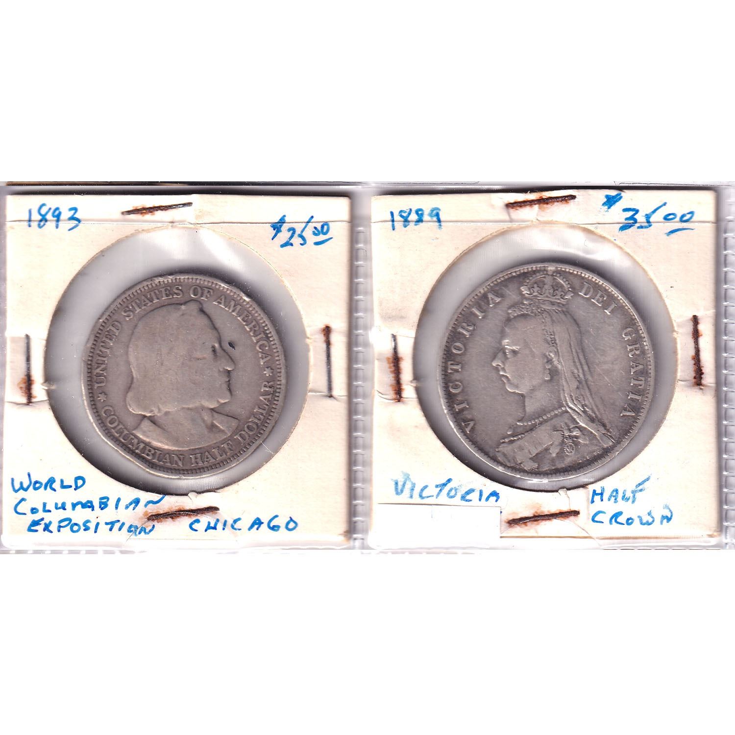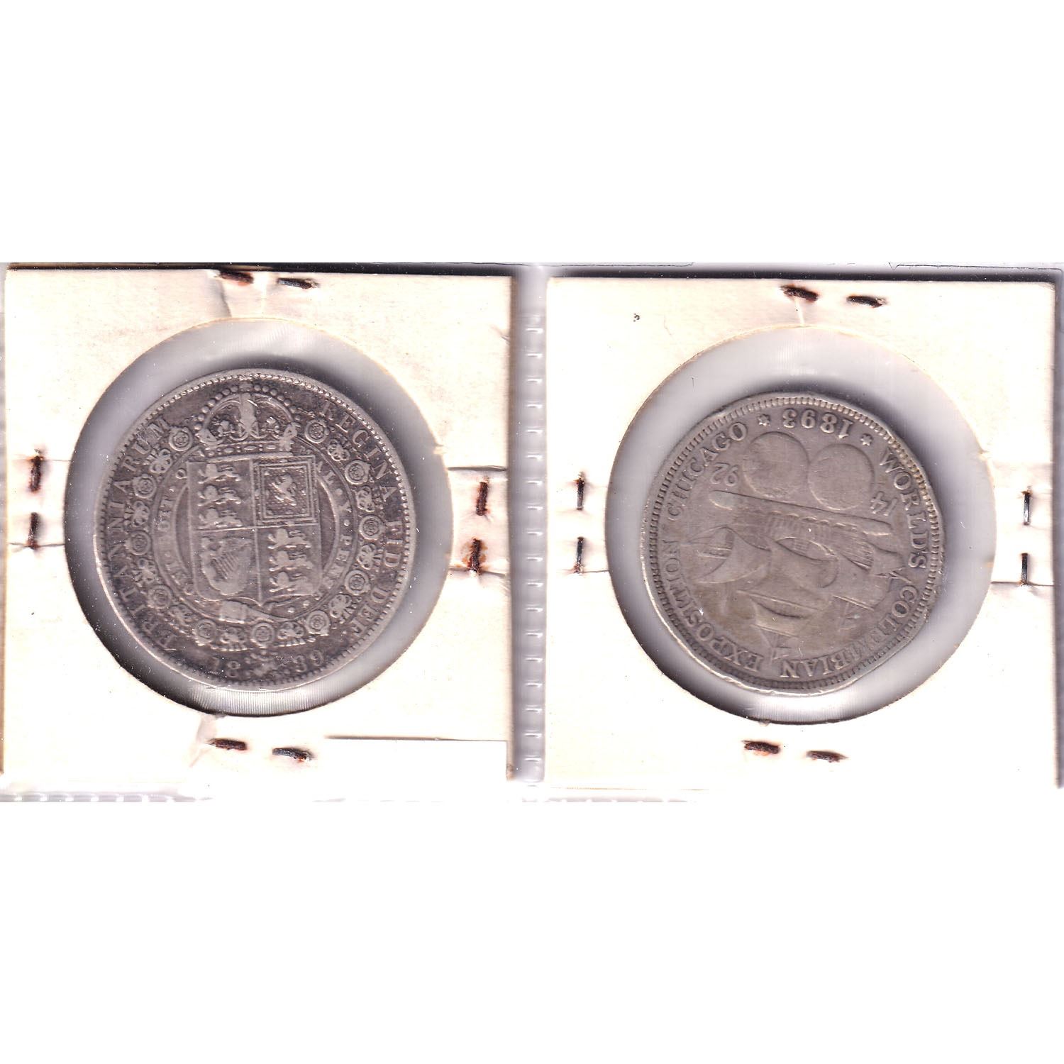 Lot of 2x 1800's Silver coins. Lot includes a 1889 G.B. Jubilee Half Crown Fine, and a 1892 Columbus World Exhibition USA 50-cent VG (Damaged). 2pcs