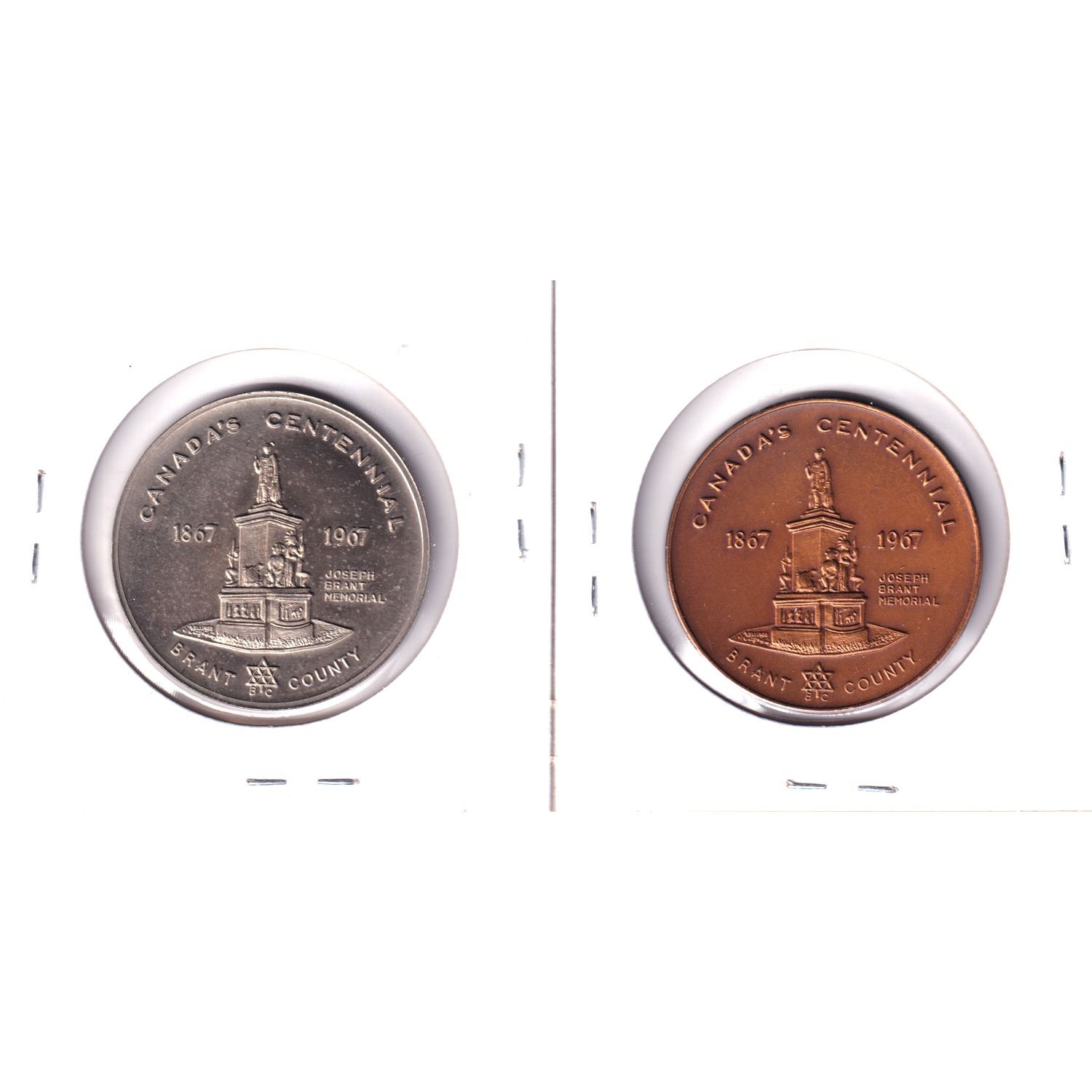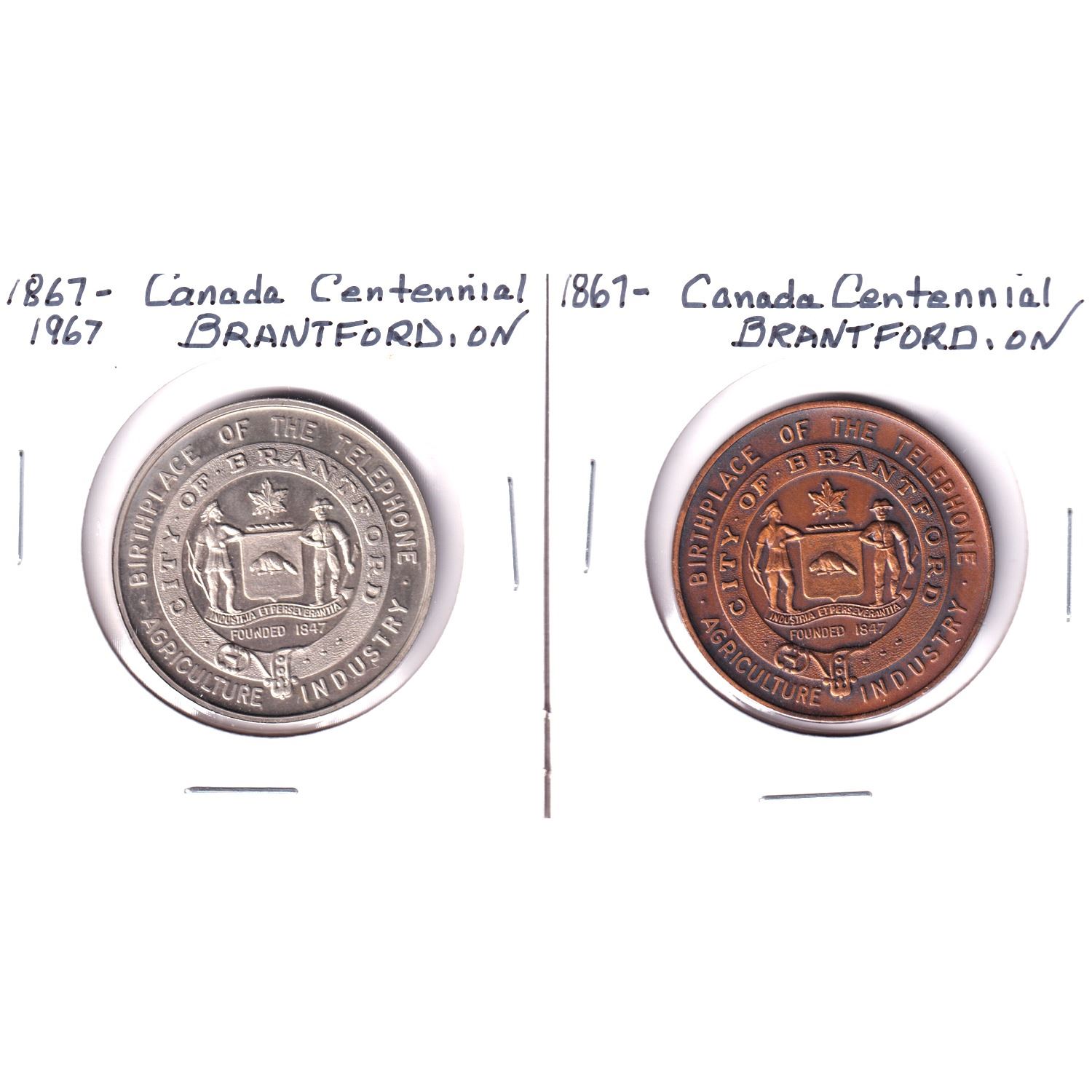 Lot of 2x 1867-1967 Canada Centennial Commemorative Token from Brantford, Ontario. Includes a copper/brass coloured one, and a silver/pewter coloured one.