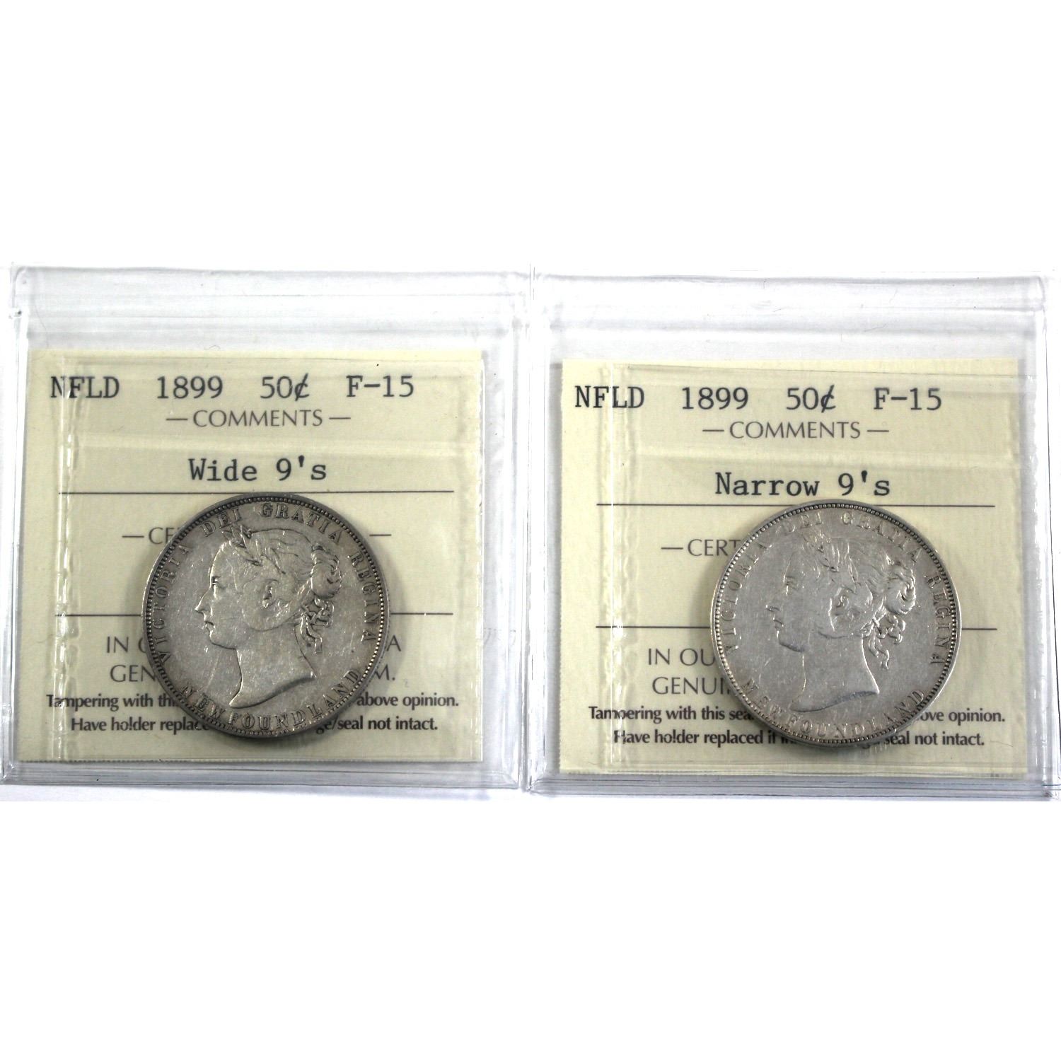 Lot of 2x 1899 Newfoundland 50-Cents ICCS Certified F-15. Includes Narrow 9s, and Wide 9s. These coins are an excellent way to display the differences between these two varieties!
