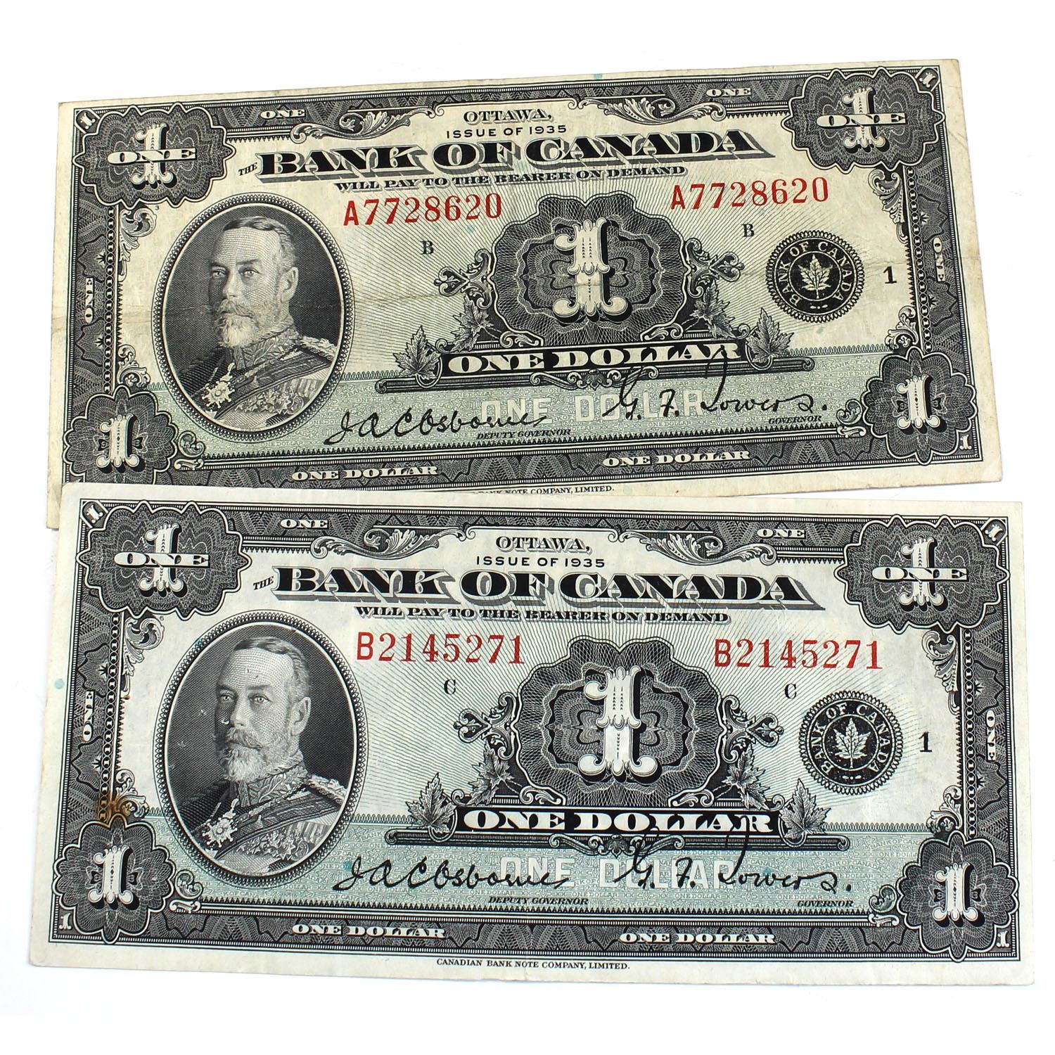 Lot of 2x 1935 $1 Notes: BC-1 & BC-2 S/N A7728620 Fine & B2145271 VF. 2pcs