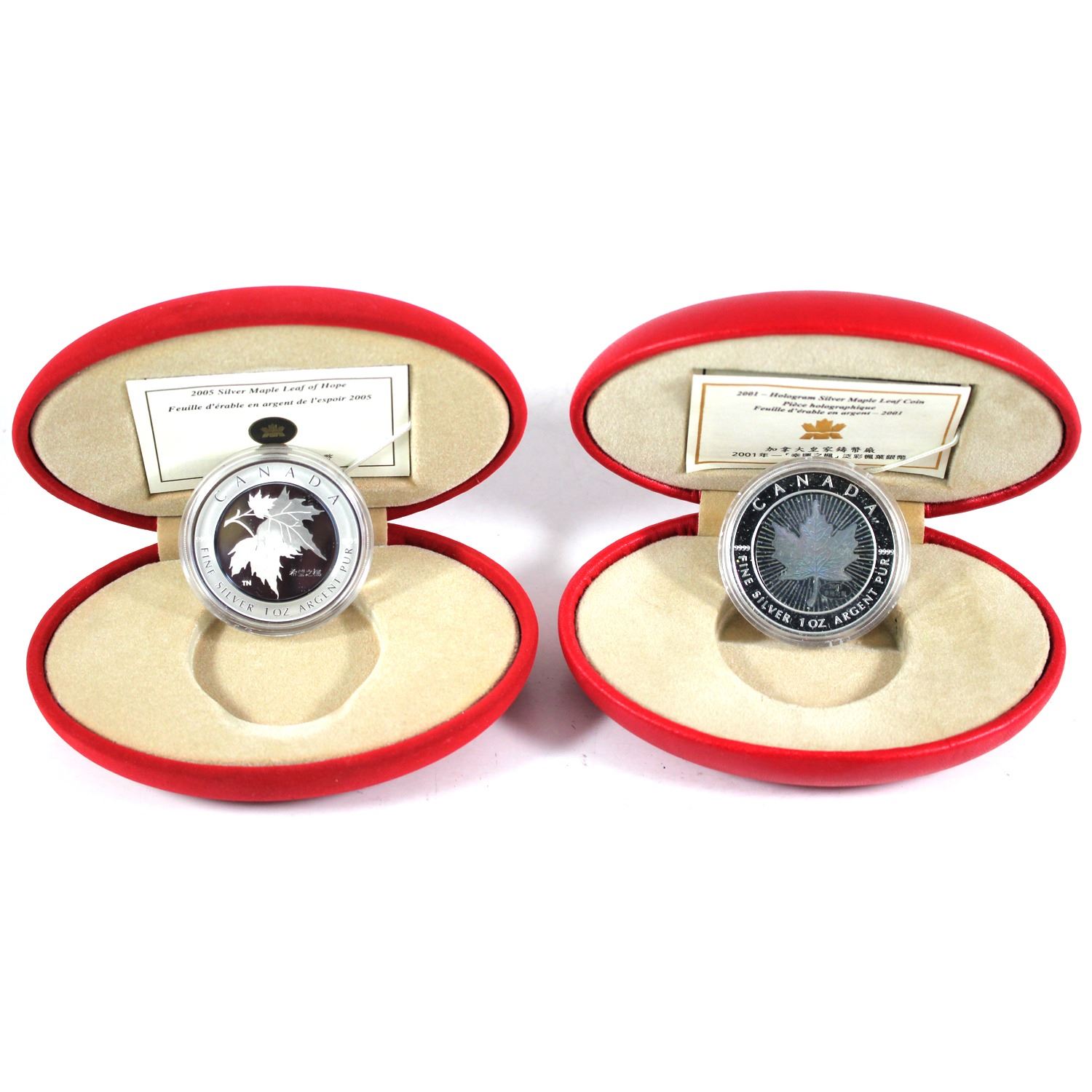 Lot of 2x 2001 & 2005 Canada $5 Fine Silver Holographic Blessings Coins. Includes 2001 Maple of Good Fortune and 2005 Maple of Hope. Coins and capsules have various imperfections.