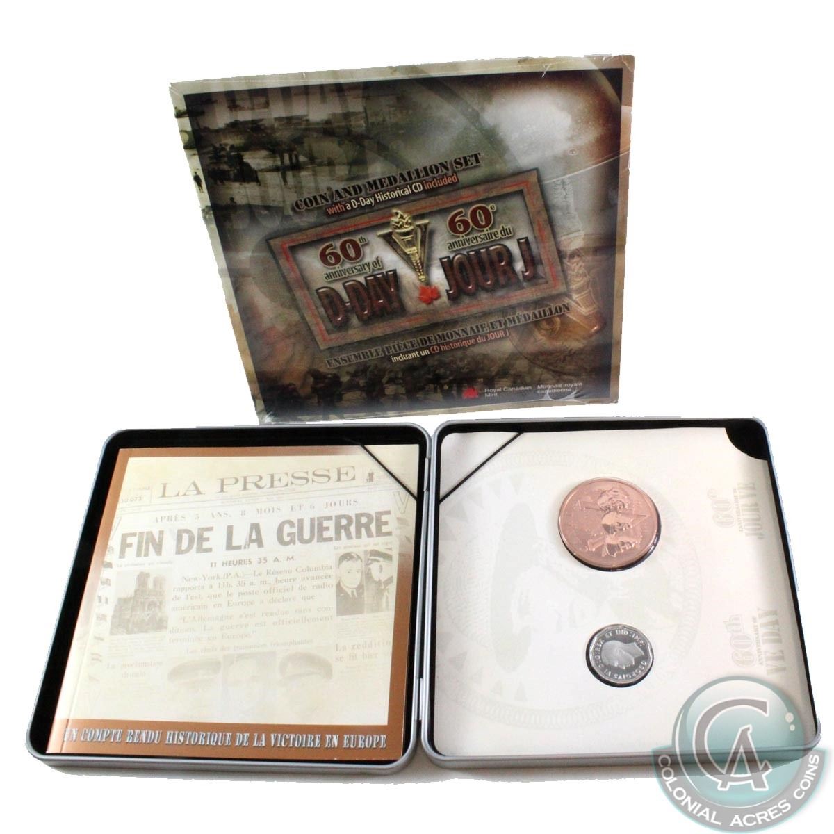 Lot of 2x 2004-2005 Canadian 60th Anniversary of D-Day and VE-Day Commemorative Sets. The sets included in this lot are the 2004 D-Day Sterling Silver Nickel & Medallion with Historical CD-ROM and the 2005 60th Anniversary of VE Day 5-cent and Medallion Set. (2pcs)