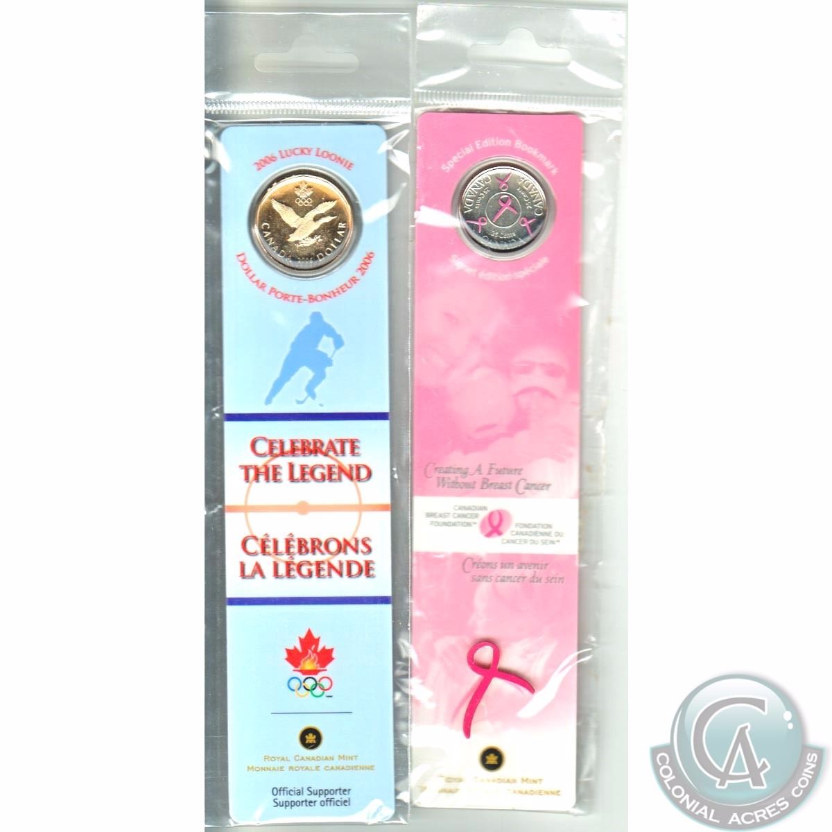 Lot of 2x 2006 Sealed Canadian Commemorative Bookmarks issued by the Royal Canadian Mint. You will receive the following bookmarks: 2006 25-cent Pink Ribbon and Lapel Pin, and the 2006 Lucky Loon Dollar. (2pcs)