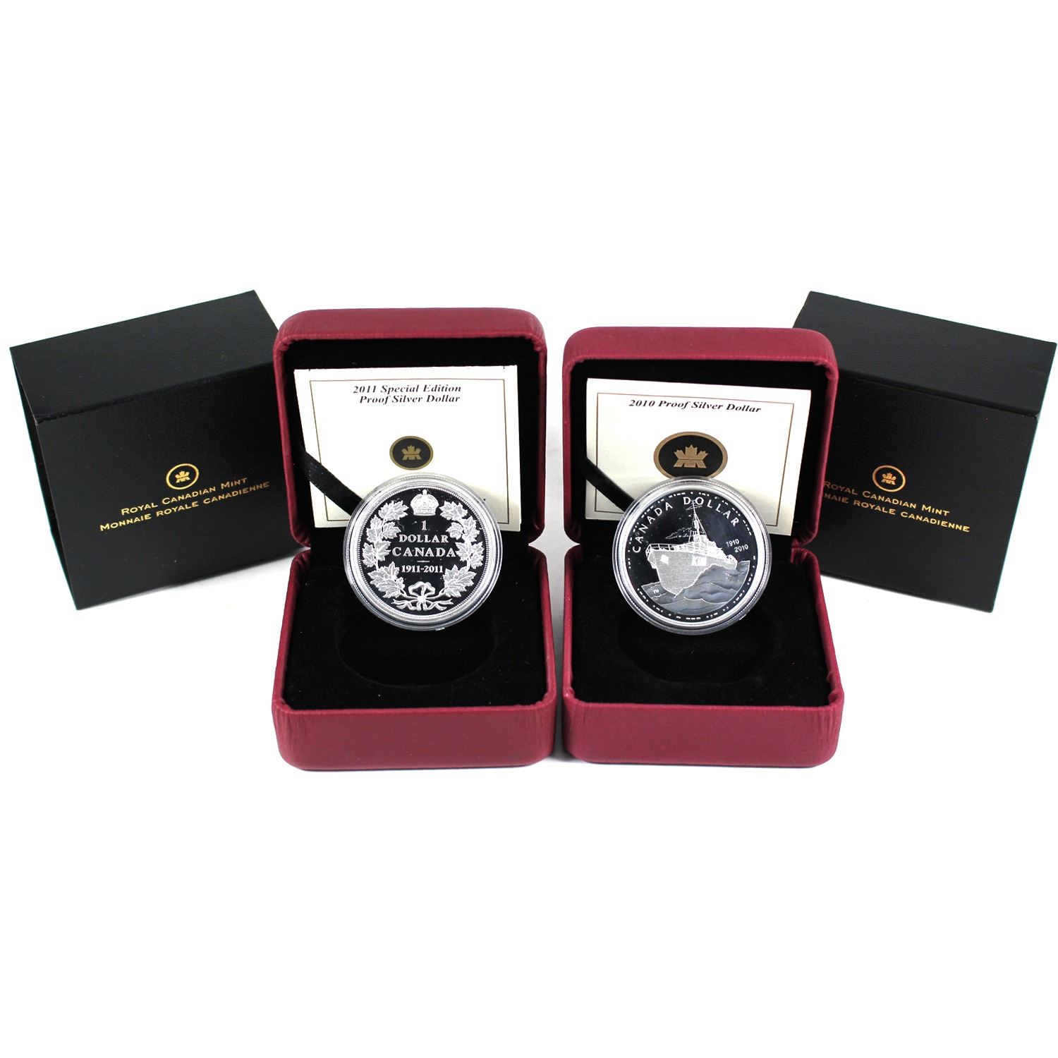 Lot of 2x 2012 & 2011 Canada Proof Silver Dollars. Includes 2010 Canadian Navy Centennial and 2011 Silver Dollar Centennial. Capsules are scuffed.