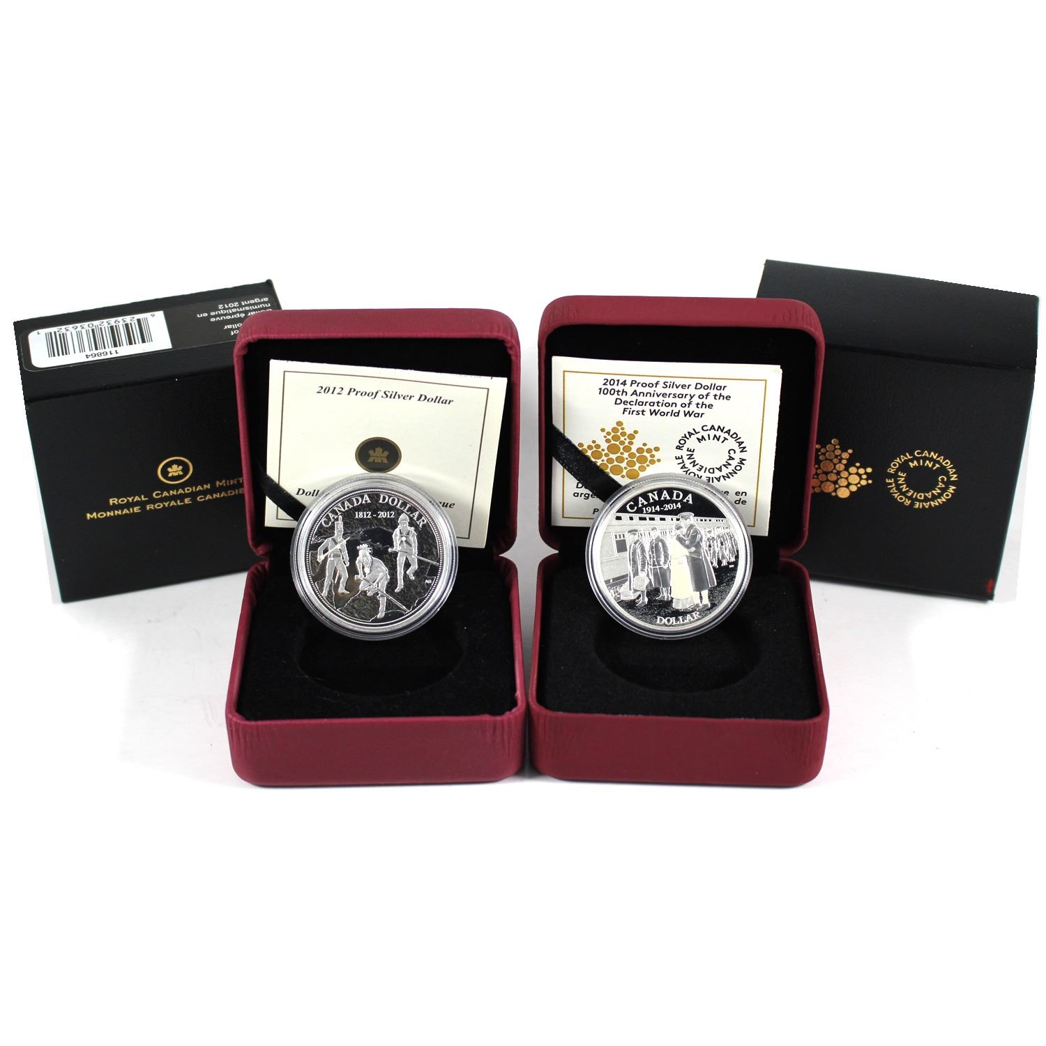 Lot of 2x 2012 & 2014 Canada Proof Silver Dollars. Includes War of 1812 Bicentennial, and 100th Anniversary of the Declaration of WWI. Capsules are scuffed.