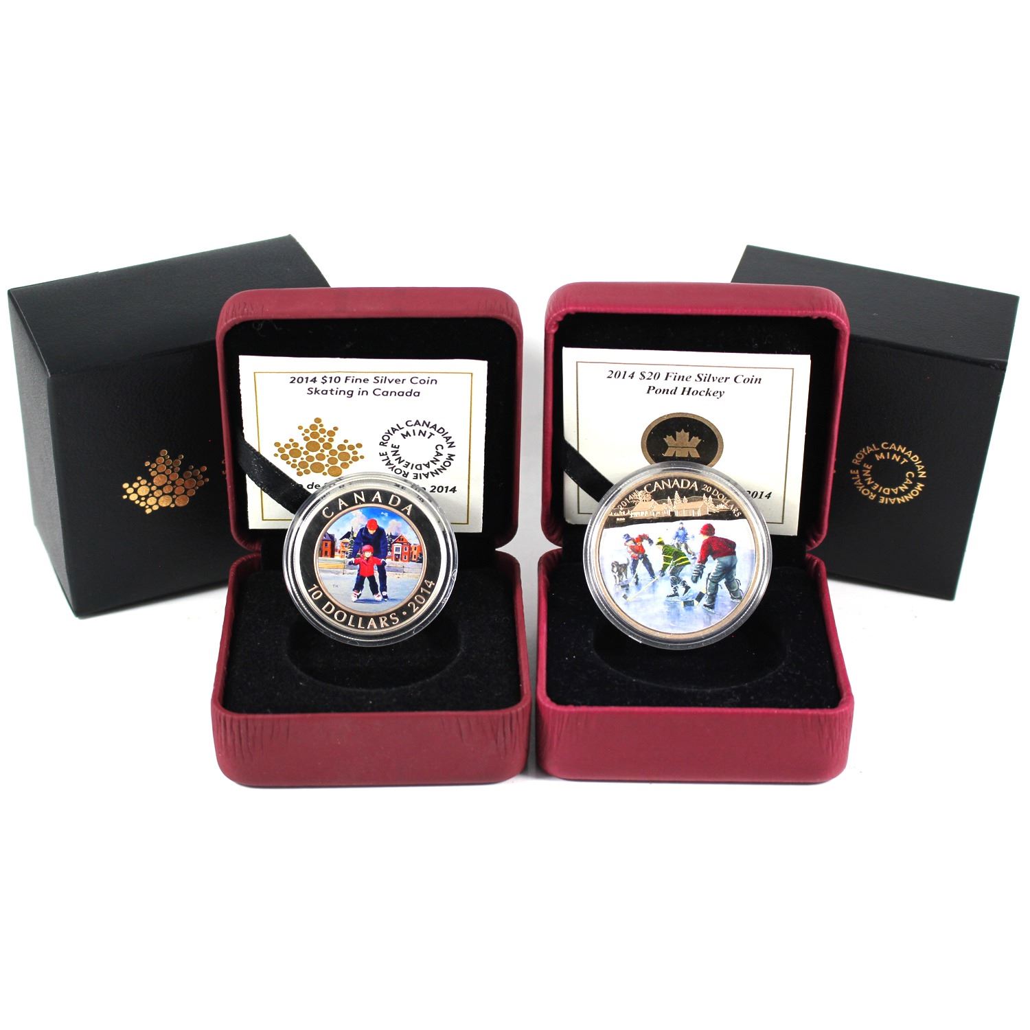 Lot of 2x 2014 Canada Fine Silver Coins Celebrating Winter. Includes $10 Skating in Canada and $20 Pond Hockey. Coins are toned, capsules have some marks.