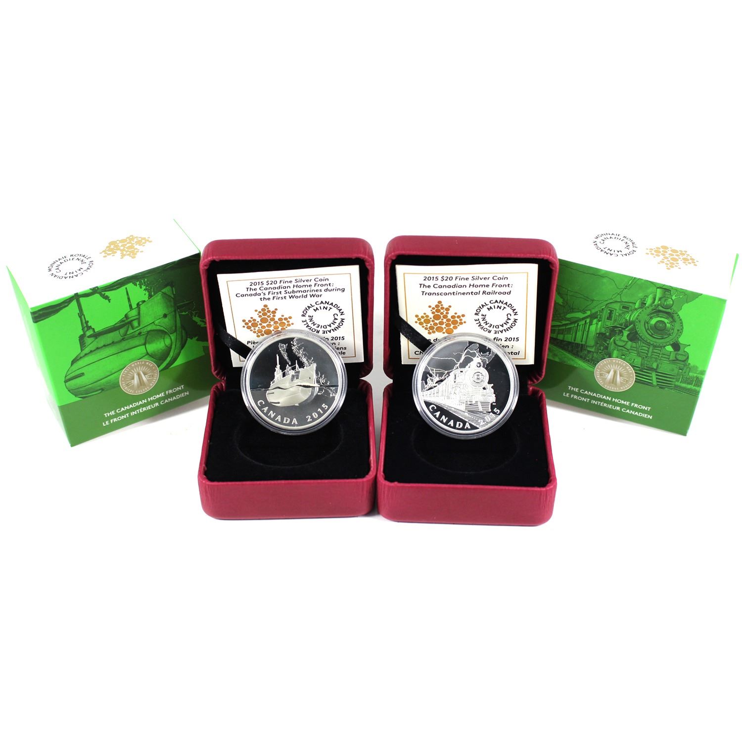 Lot of 2x 2015 $20 The Canadian Home Front Fine Silver Coins. Includes First Submarines During WWI and Transcontinental Railroad. Minor imperfections.