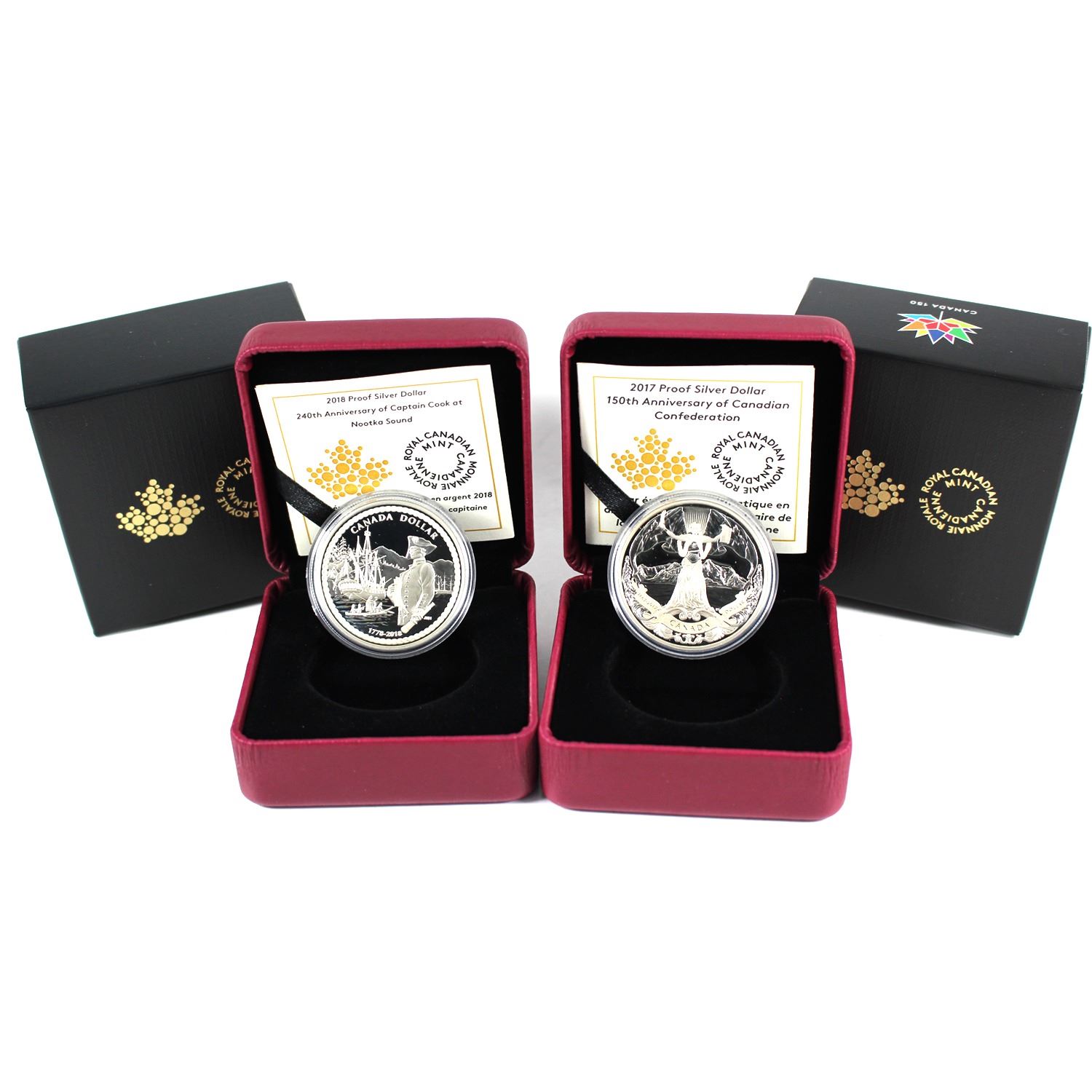 Lot of 2x 2017 & 2018 Canada Proof Silver Dollars. Includes 2017 150th Anniversary of Canadian Confederation and 2018 240th Anniversary of Captain Cook at Nootka Sound. Lightly toned.