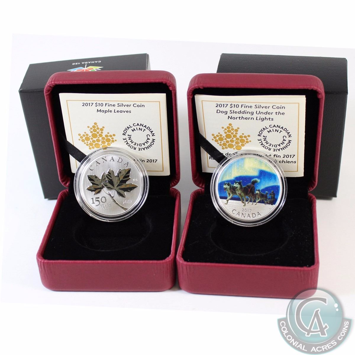 Lot of 2x 2017 Canada $10 Fine Silver Coins. You will receive Dog Sledding Under the Northern Lights & Maple Leaves. 2pcs (TAX Exempt)